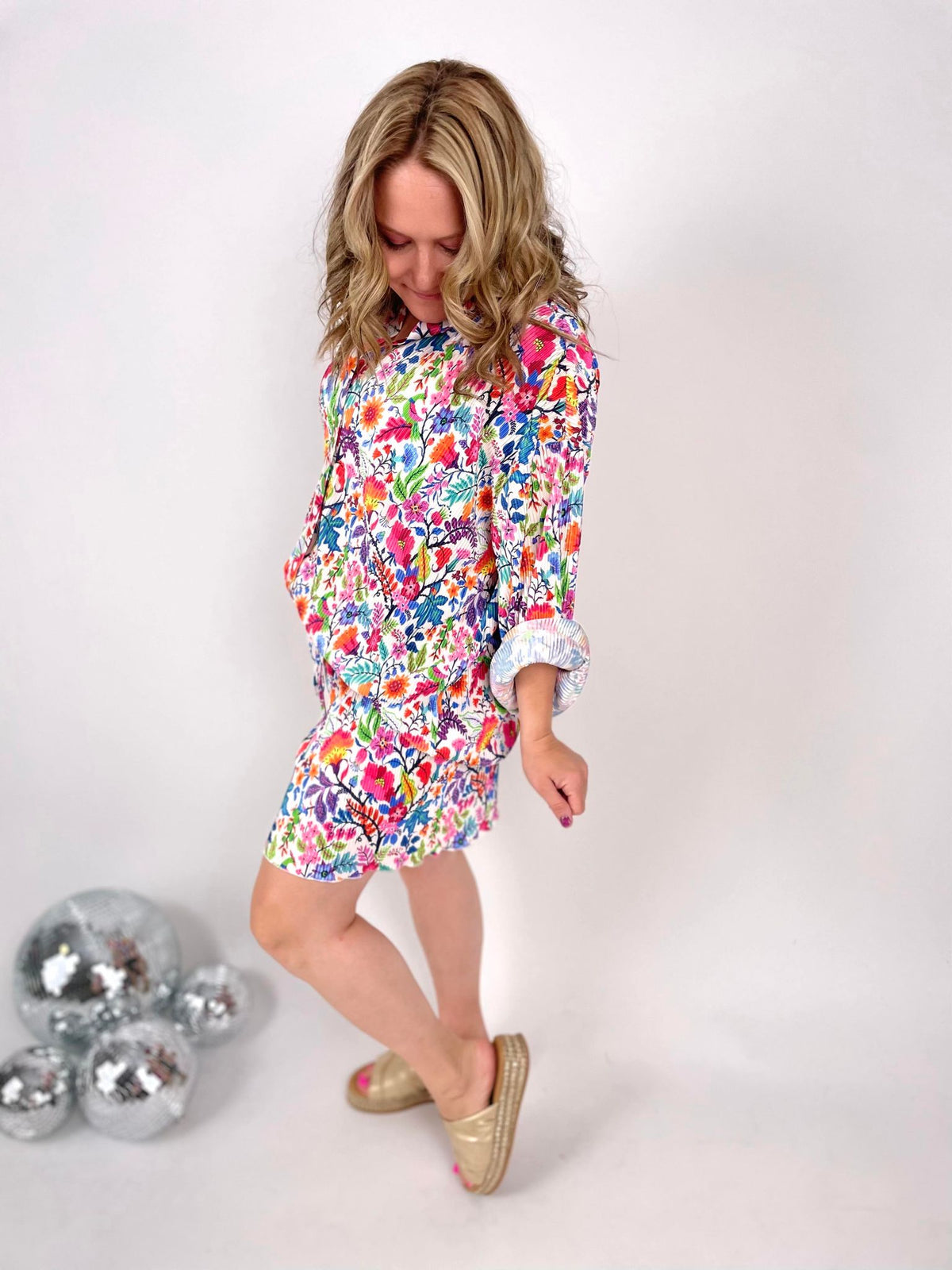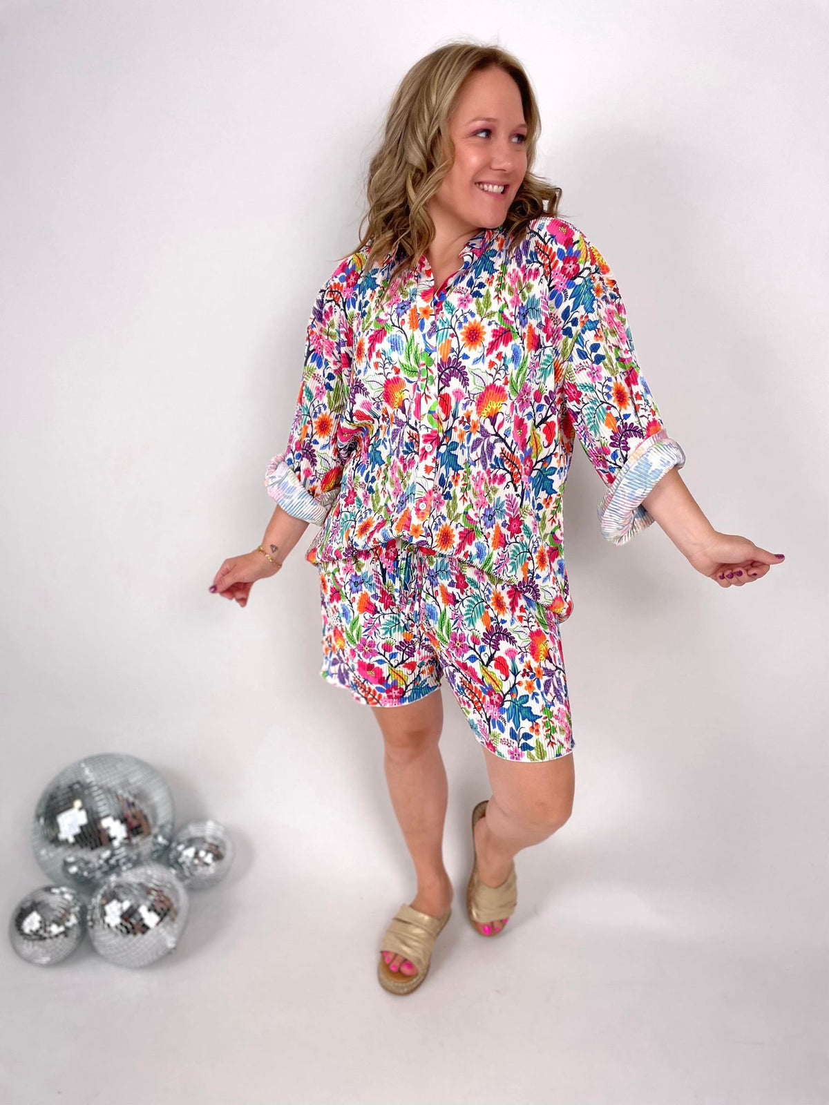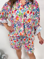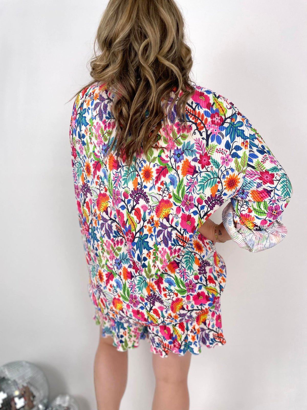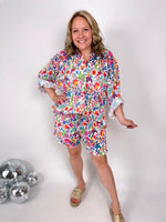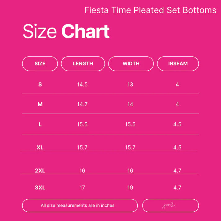 Experience a fiesta of style with our Fiesta Time Pleated Set! This printed set features a long-sleeved button-up top and shorts with a convenient drawstring and pockets. The eye-catching lettuce hem adds a playful touch. Perfect for a day out or a fun night in!