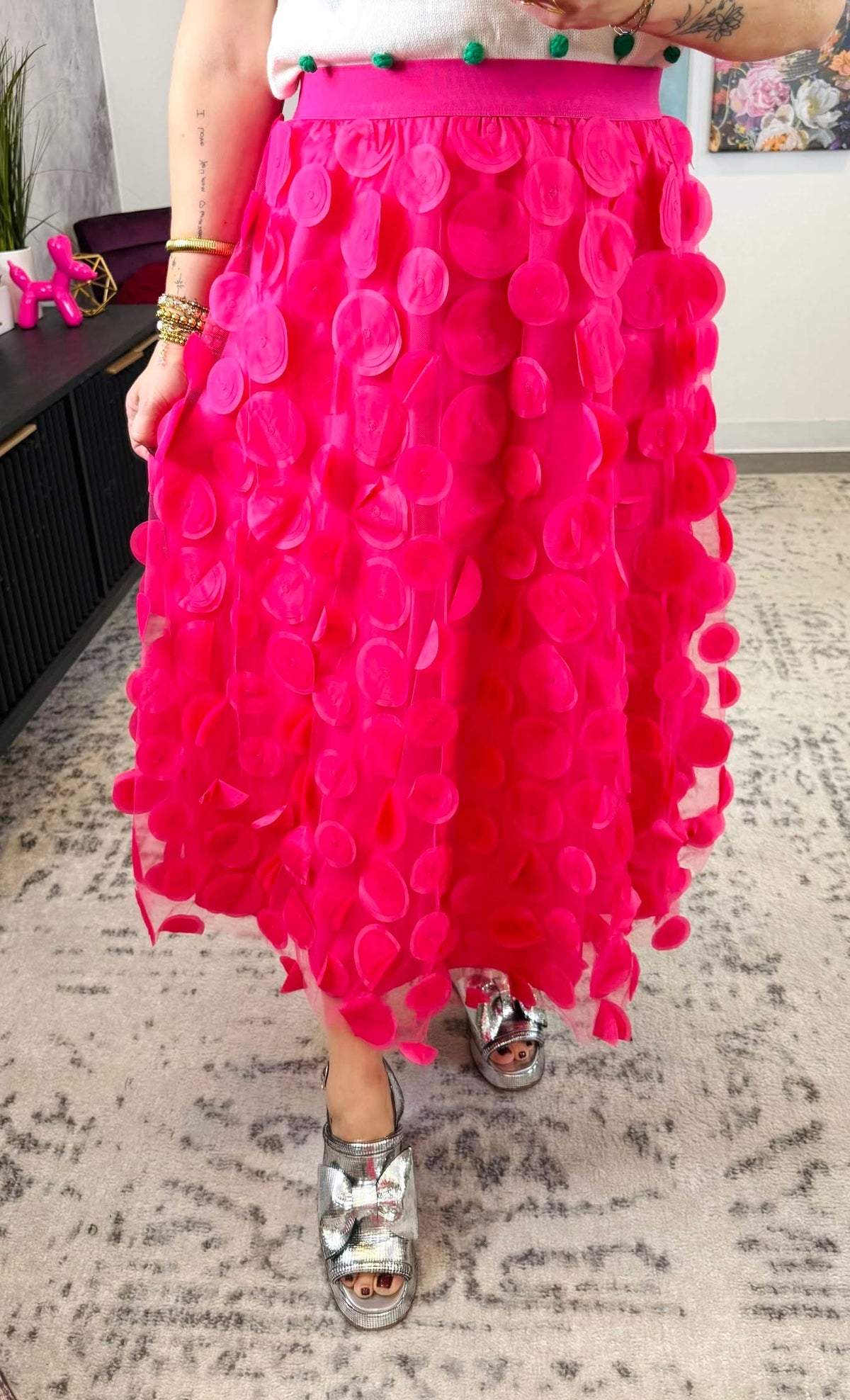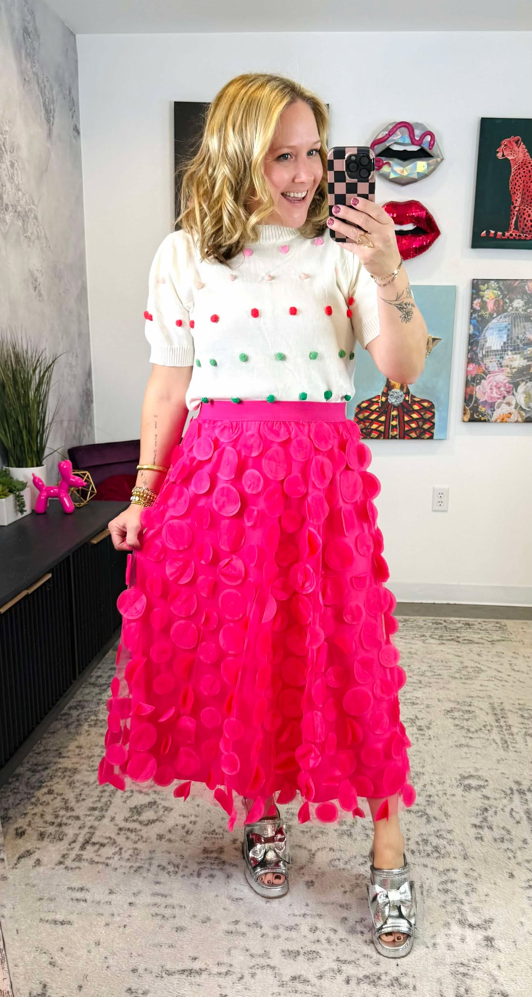 Brighten your wardrobe with the Dottie Daydream Skirt, featuring charming 3D circle embellishments that add a fun, textured flair. This playful tulle mesh skirt is lightweight yet non-sheer and offers comfortable coverage while keeping your look light and breezy and its flattering silhouette dances with every step. Available in sizes S to XL to fit your perfect daydream look and making every moment a little more magical.
