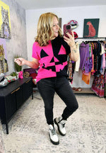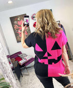 Add a touch of spooky fun to your wardrobe with our Pink Pumpkin Sweater. This playful short sleeve sweater features a festive jack-o-lantern design in pink and black, on the front and the back. Perfect for Halloween. Stay cozy and stylish with this must-have piece.