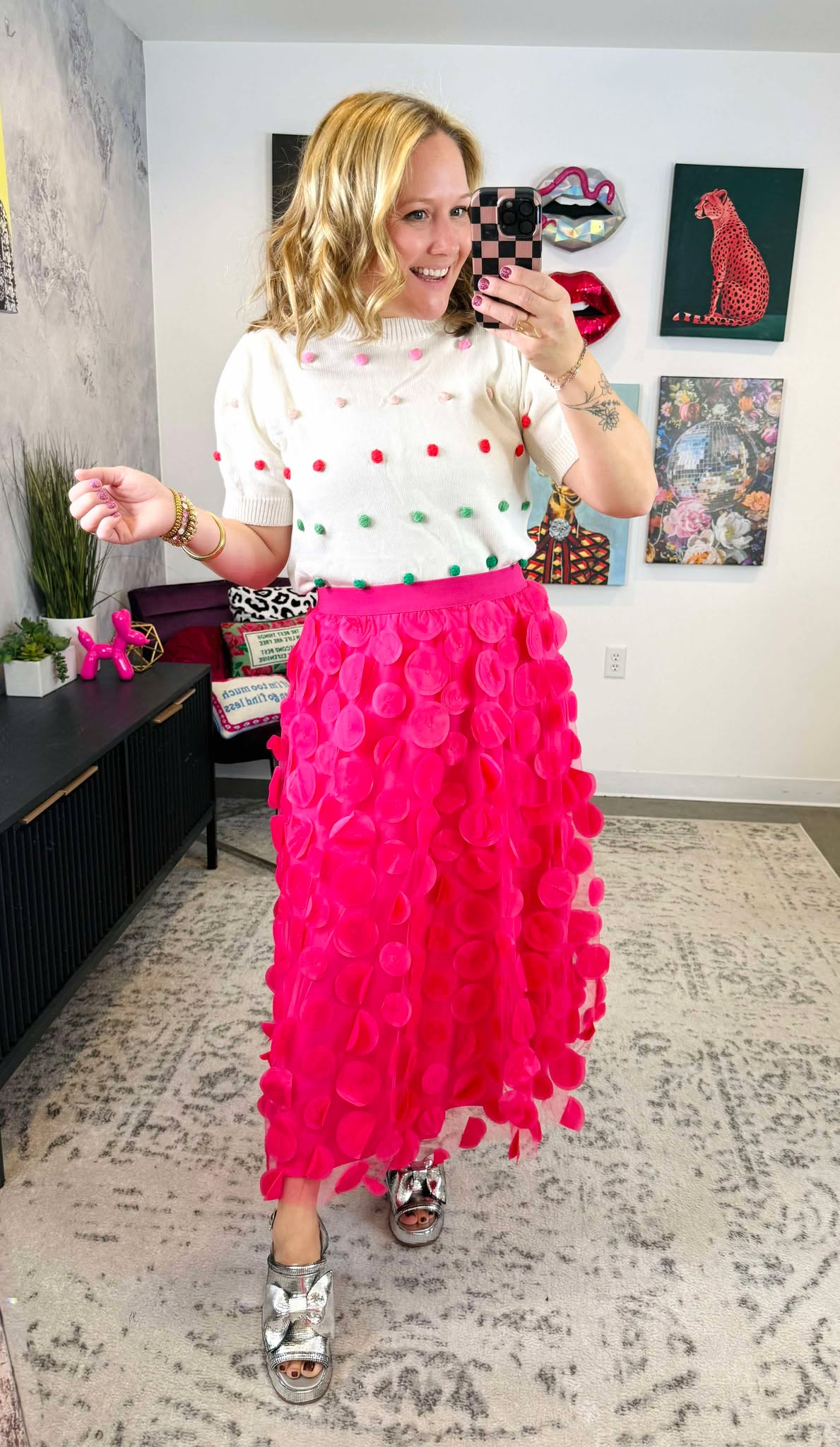 This playful pom-pom knit top features a flattering U-neck and charming short puffed sleeves, perfect for adding a fun twist to your look. The ribbed hems keep it cozy and stylish, while the lightweight fabric ensures comfort without being sheer. Ideal for casual outings or layered fun, this top brings a lively vibe to your wardrobe.