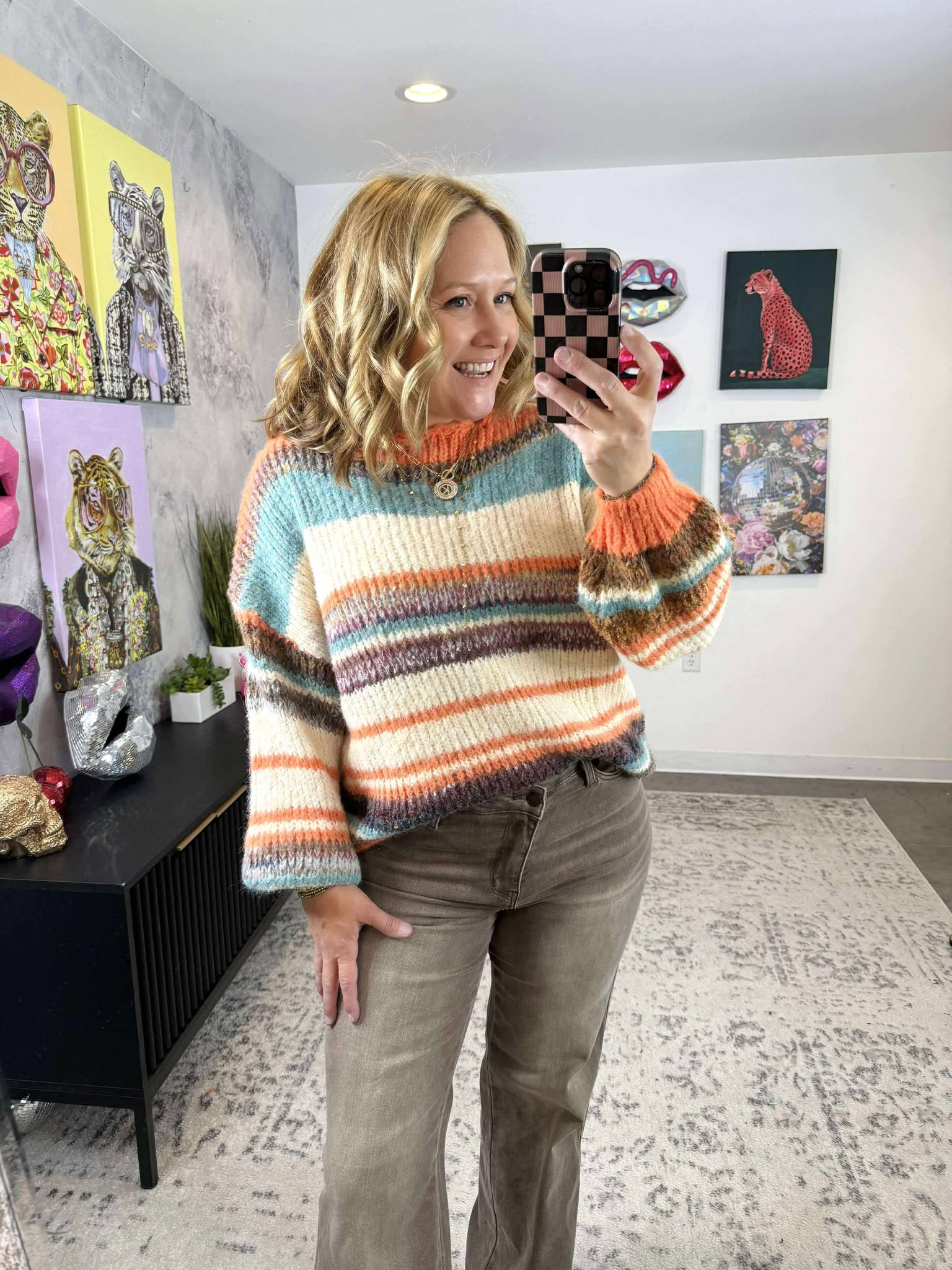 Add a splash of fun to your wardrobe with the Linear Comfort Sweater! Its classic crew neck and playful stripes make it the perfect go-to for cozy days and casual outings. Soft and comfy, this sweater keeps you snug without sacrificing style—whether you're lounging at home or out with friends. Embrace effortless charm in every stripe!