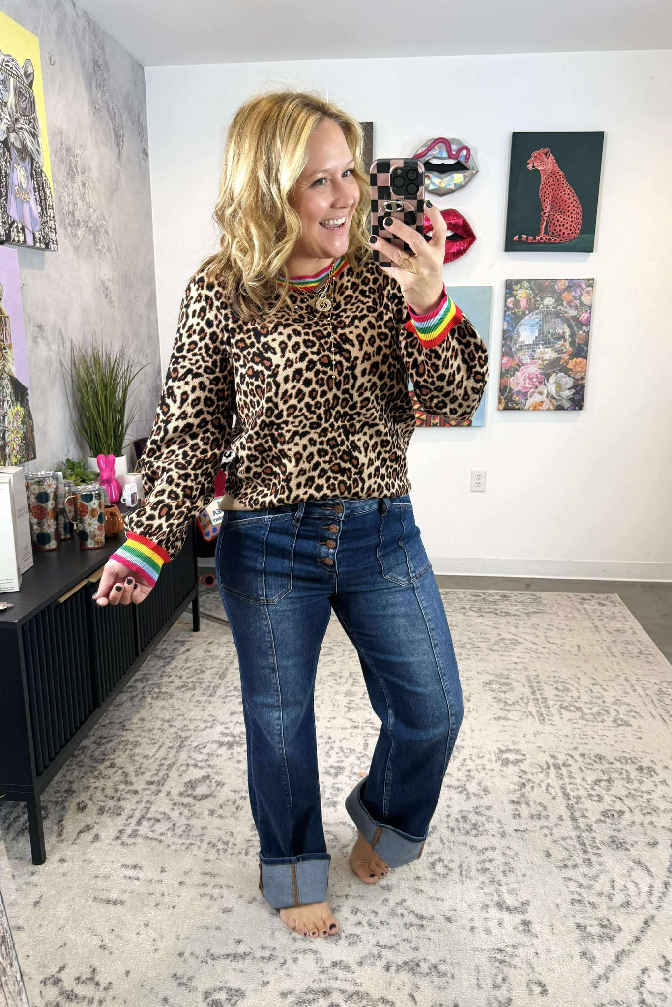 Unleash your wild side with the Wild Prism Sweater! Featuring a bold leopard print and puff sleeves with vibrant multicolor neck and cuff bindings, this sweater adds a playful pop to any outfit. Comfortable and eye-catching, it’s perfect for those who love to mix fun with fashion, offered in sizes S to 2X.