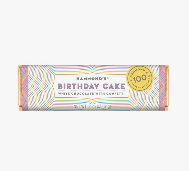 Hammonds Birthday Cake White Chocolate Bar - 100 Year Anniversary Bar! White Chocolate with Confetti Sprinkles! If you're a fan of white chocolate you will fall head of heels for this bar! This is great for any birthday parties and events. This flavor is delicious! Shelf life - 5 months guaranteed from receipt of goods. Use by 5/30/24