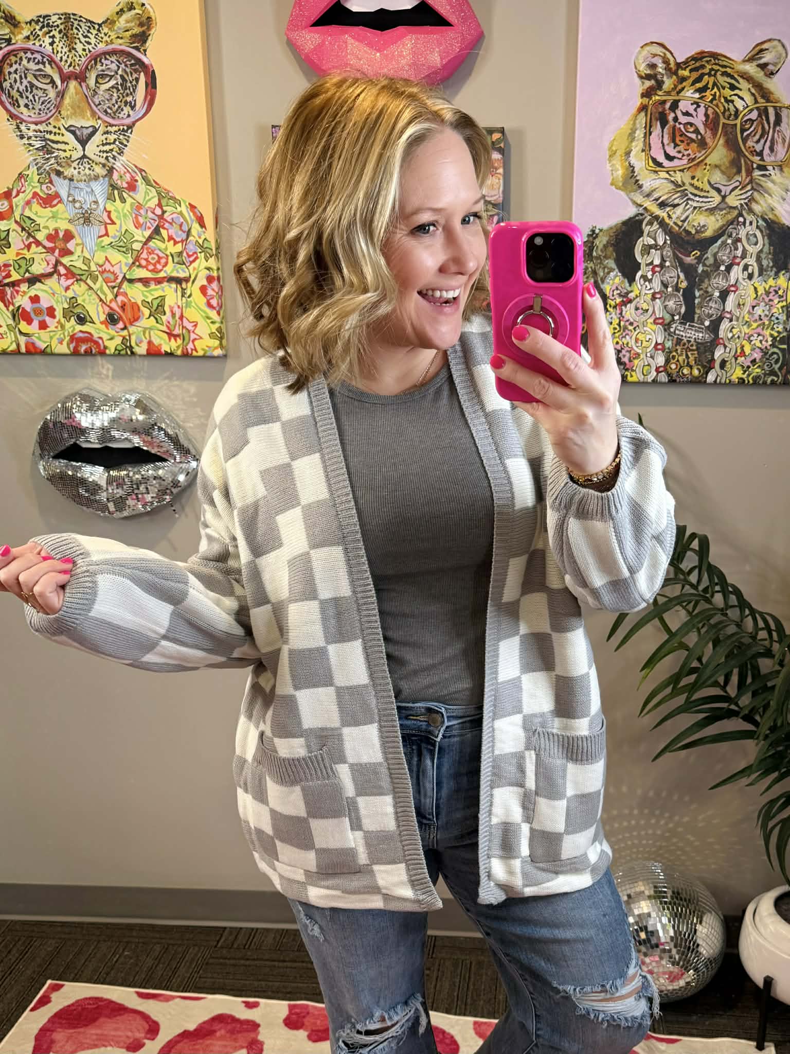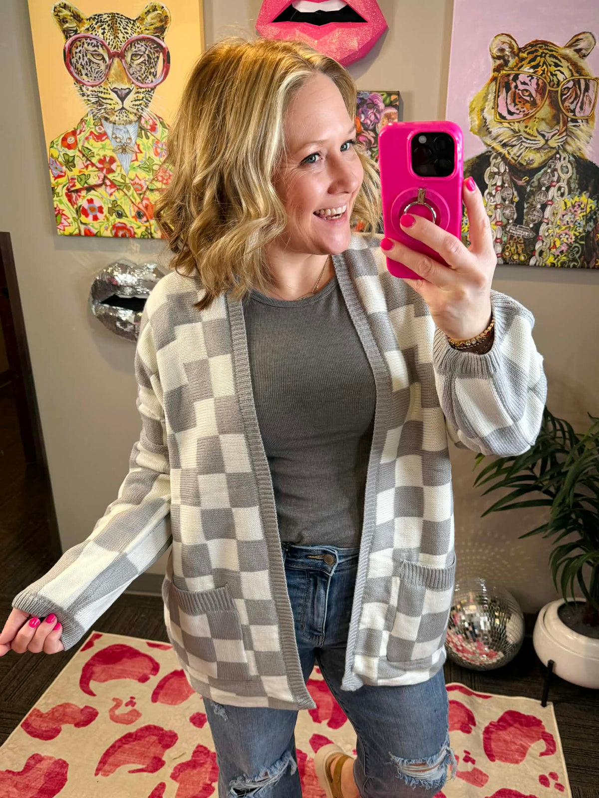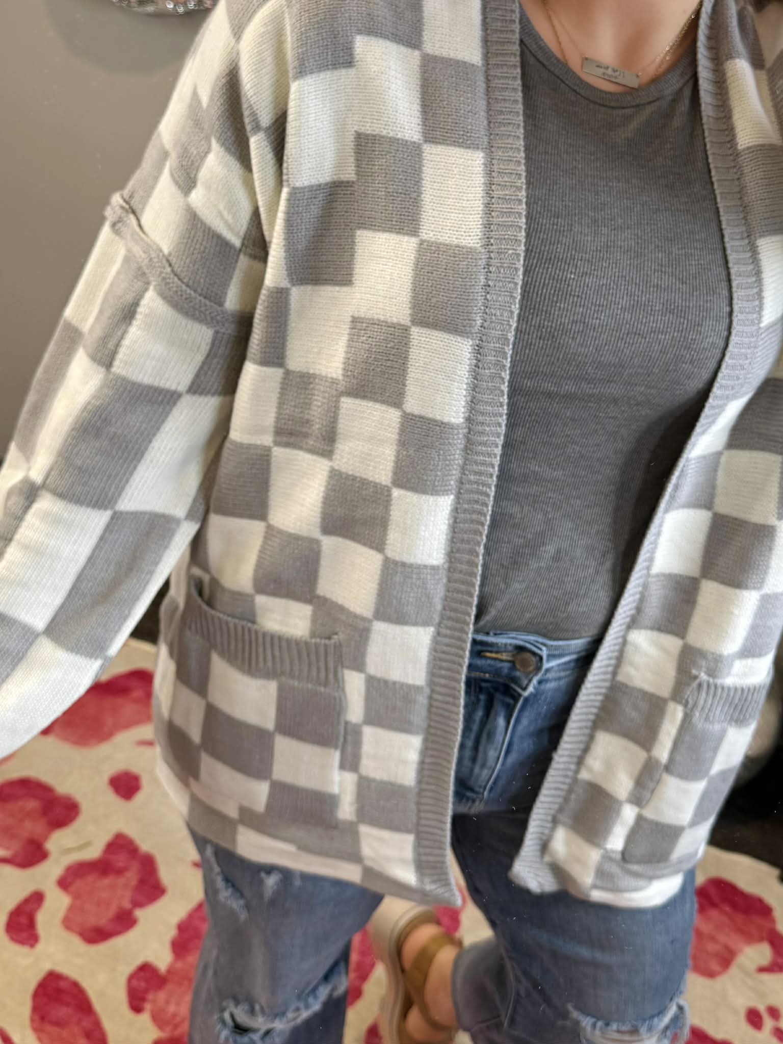 Effortlessly chic, this Blakeley Beverly cardigan features a classic grey and white checkered pattern perfect for layering. Crafted from soft, stretchy 100% acrylic, it drapes beautifully with an open front and functional pockets for everyday convenience. At approximately 28" in length with a roomy fit, it's designed to flatter and move with you. Available in OS (0-12/14) and CURVY (14-22) sizing.