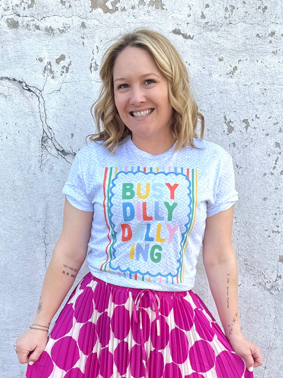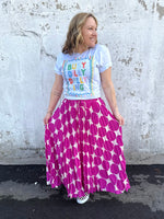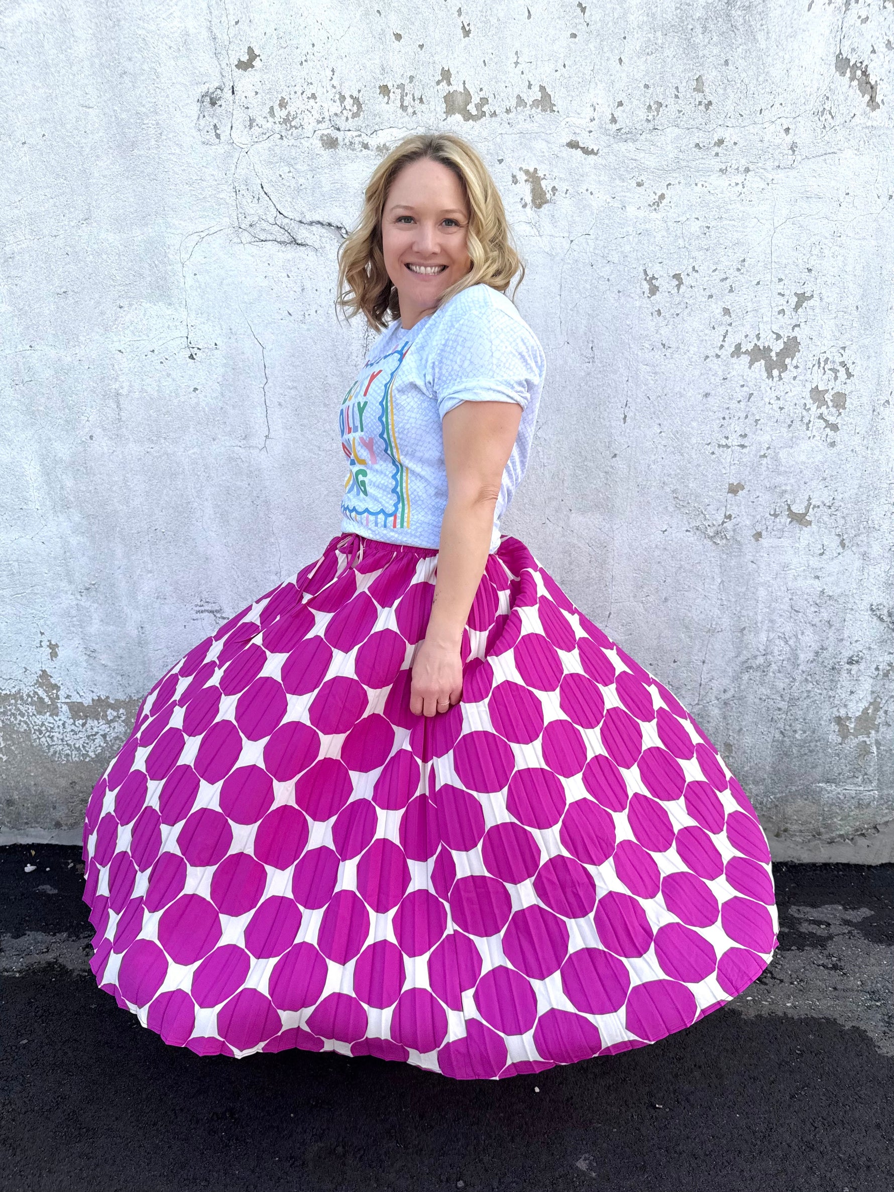Get ready to turn heads with our Magenta Marvel Pleated Skirt! Featuring a playful Big Dot pattern print, this maxi skirt will add a touch of fun to any outfit. The stretchy drawstring waistline ensures a comfortable fit for all body types. Stylish and comfortable, it's the perfect skirt for any occasion.