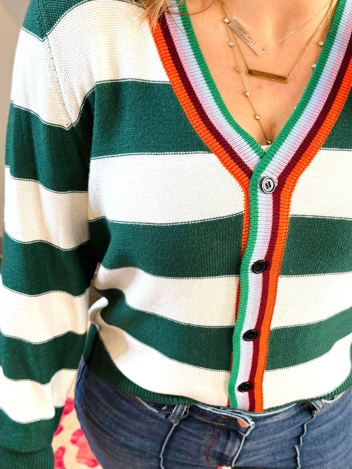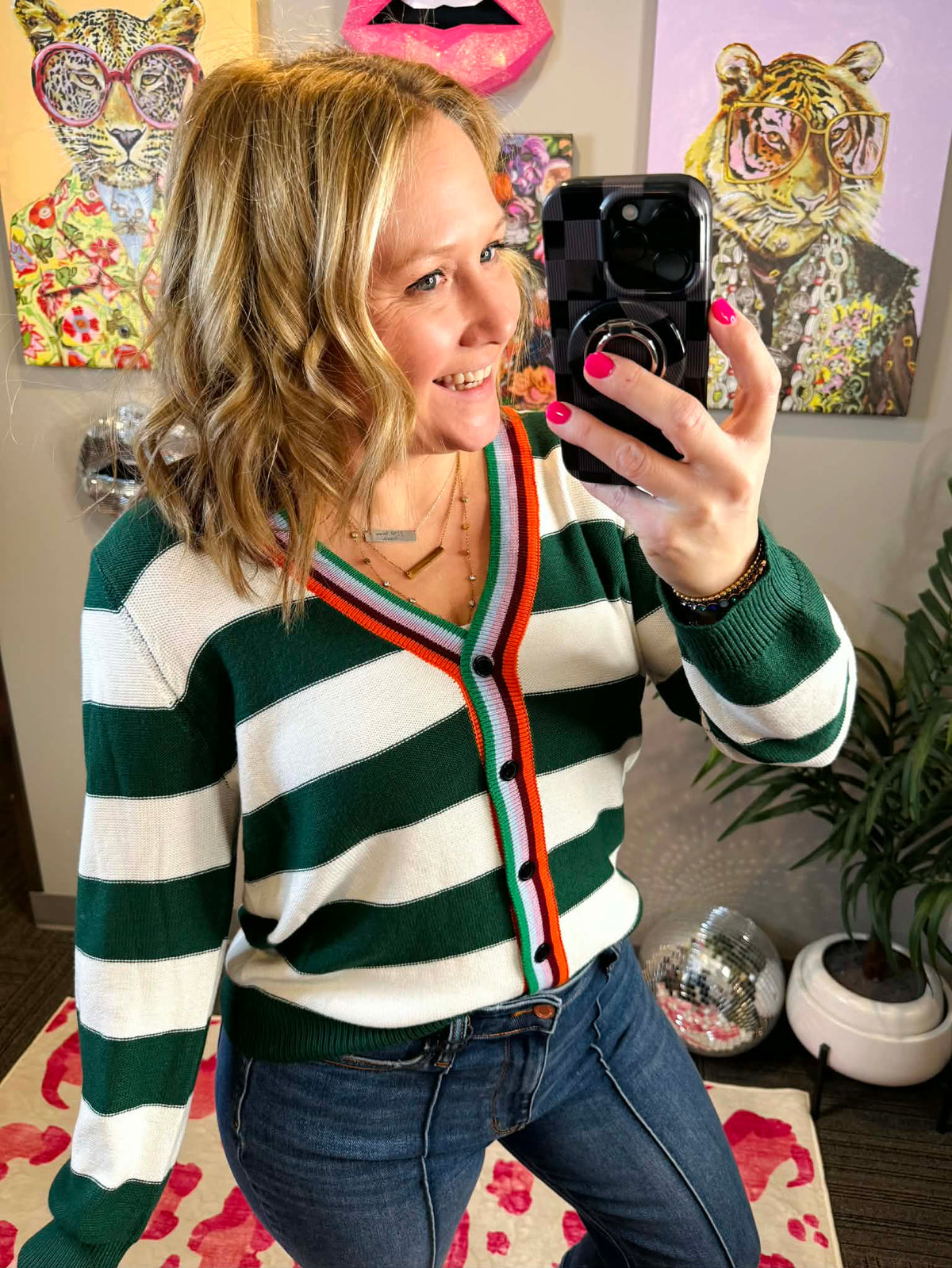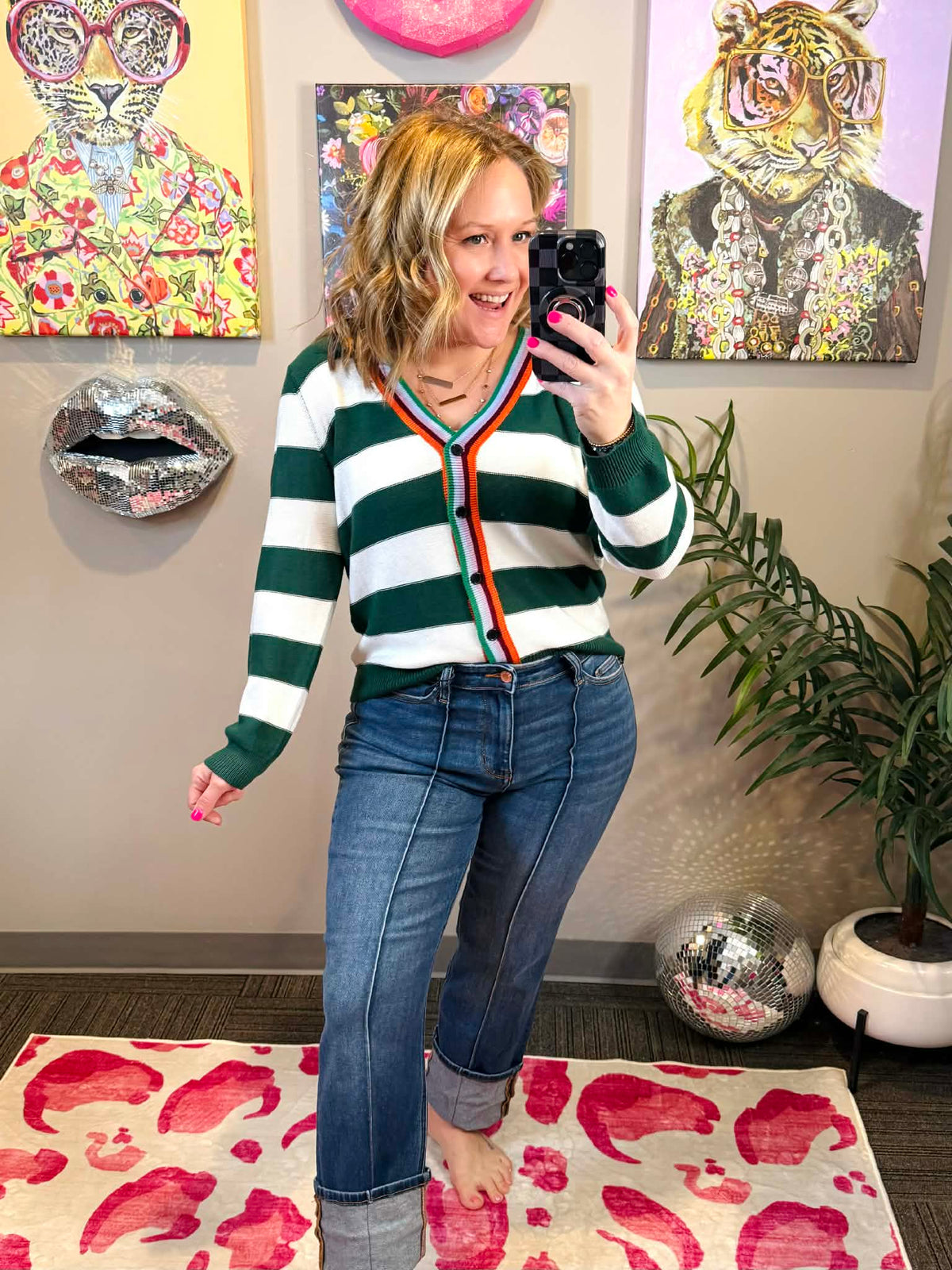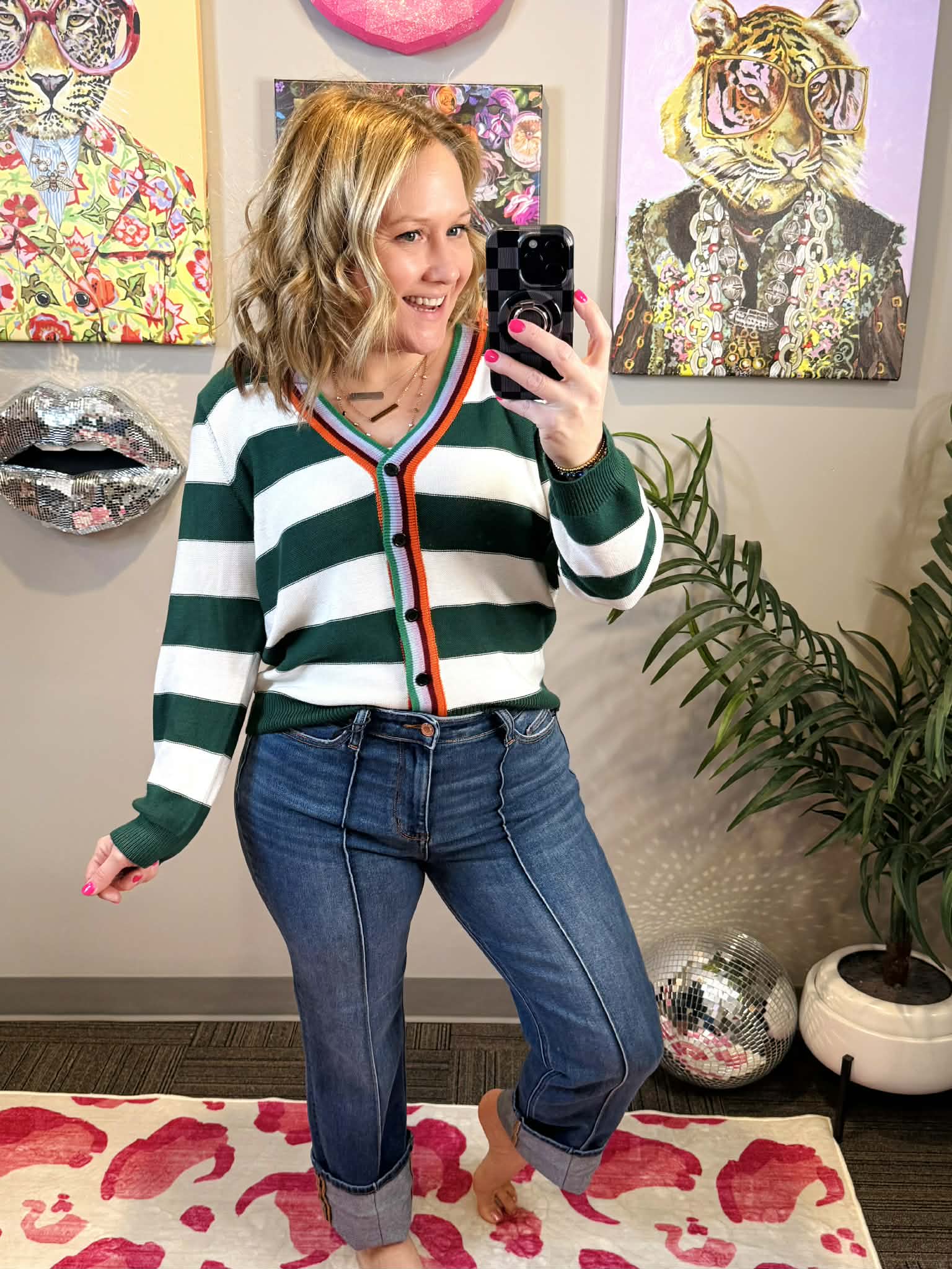 This Sharp Lines Cardigan Top is your go-to for a fun twist on classic style. Featuring bold stripes and easy button-down closure, it’s perfect for layering or wearing solo. Cozy yet eye-catching, it adds a playful pop to any outfit from S to L.