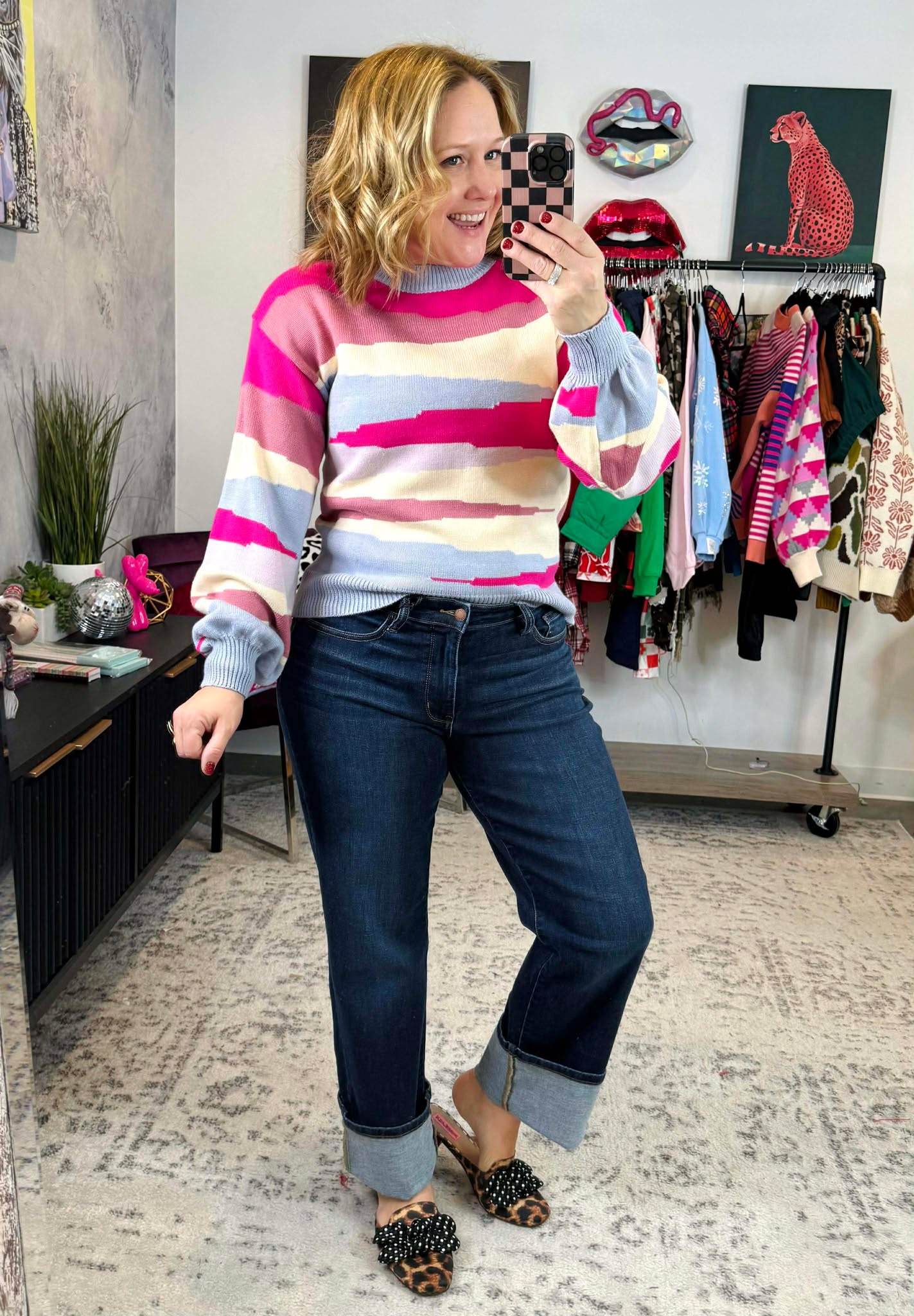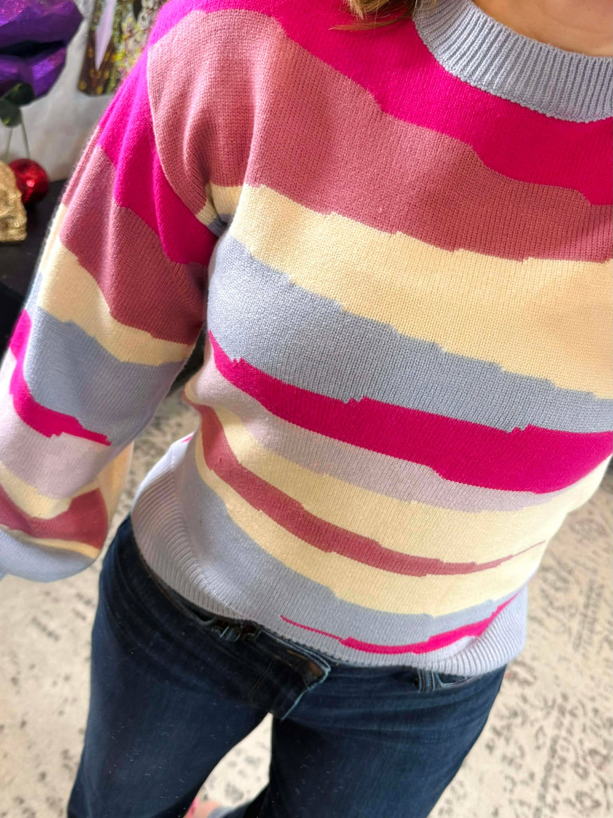 Embrace eclectic fashion vibes with our Rose Quartz Sweater. The multi-colored knit and drop shoulder add playful charm while the ribbed crewneck and balloon sleeves offer a cozy fit. Perfect for a relaxed, yet stylish look. Get ready to slay, fashionista!