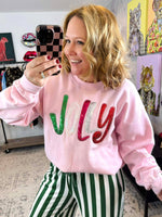 Spread holiday cheer in this cozy pink sweatshirt featuring a joyful "JOLLY" design brought to life with handcrafted sequin appliqués. Each piece is individually sewn, making it a one-of-a-kind wearable work of art. Perfect for festive gatherings, casual outings, or anyone who loves unique, artisan-made fashion. Available in sizes S-3X.