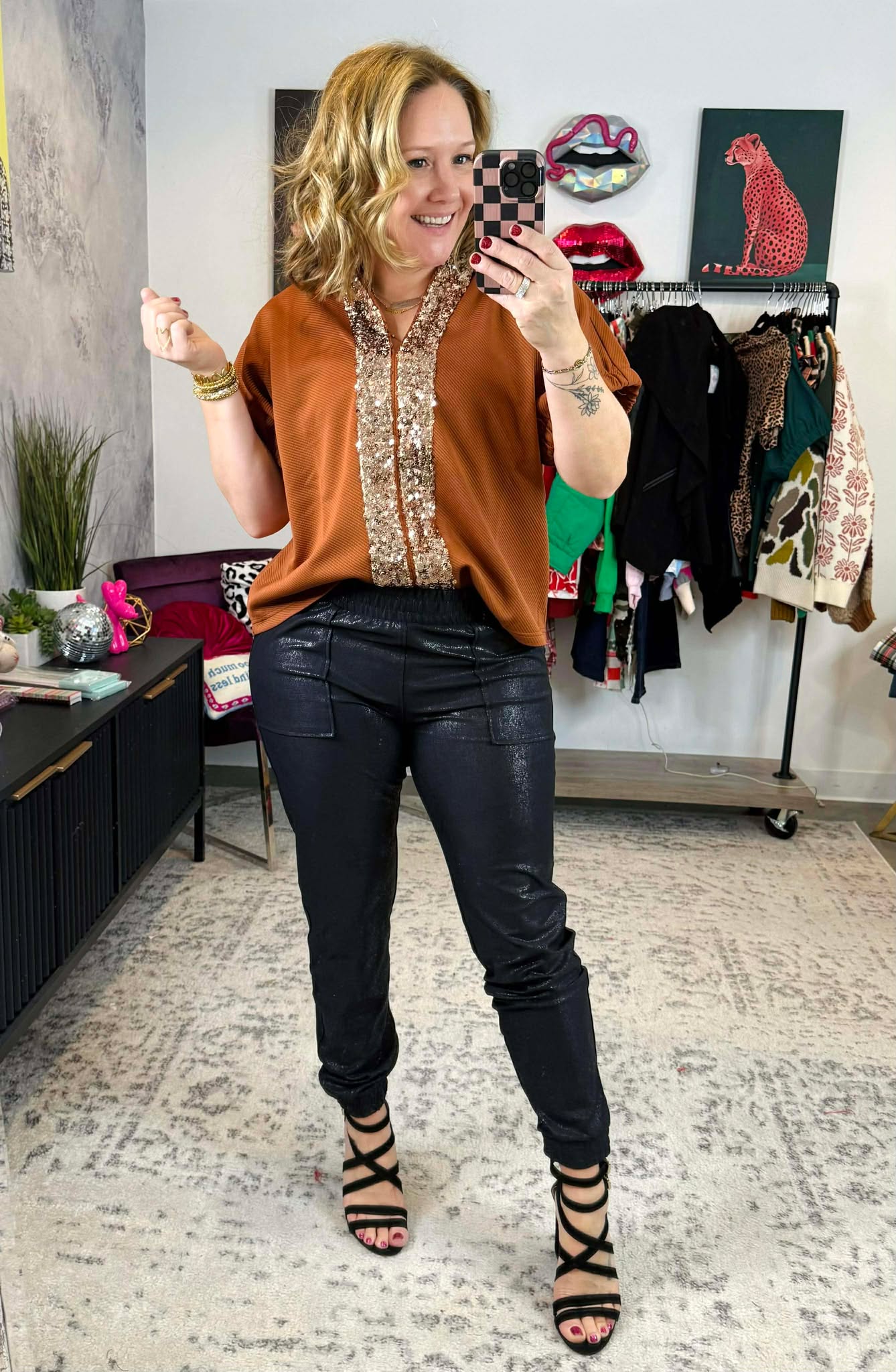 Shine bright in this playful Twinkle Split Top, where sequined trim catches the light with every move. The charming split neckline adds a flirty touch, while the short sleeves keep things breezy and comfortable. Perfect for nights out, parties, or whenever you want to sparkle a little brighter. Available in a gorgeous camel tone that pairs effortlessly with your favorite pieces.