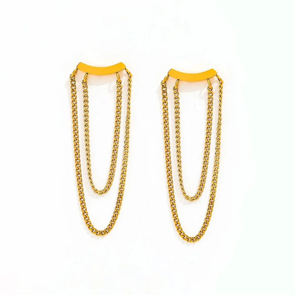 Add some flair to your outfit with the Drape & Dazzle Waterproof Earrings. Made with 18K gold plated stainless steel and a double-layered dainty Cuban chain, these tassel stud earrings are sure to catch some eyes. Don't worry about a little water, these earrings are waterproof!