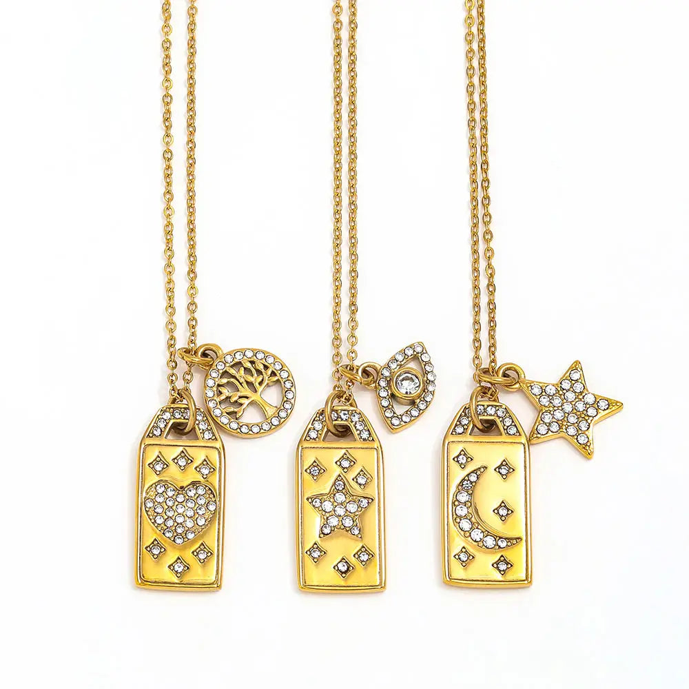 Shine bright with this Moon + Star Tag Necklace! Adorned with pave rhinestones, this 18k gold plated stainless steel necklace is perfect for any outfit. Waterproof for all your adventures.