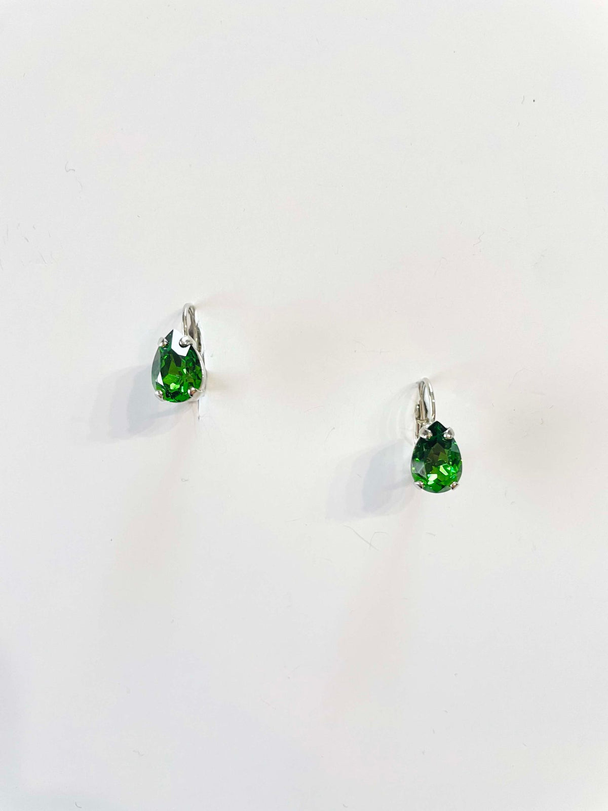 10mm Pear Drop Earrings set into Shiny Silver Metal with Fern Green Crystals.