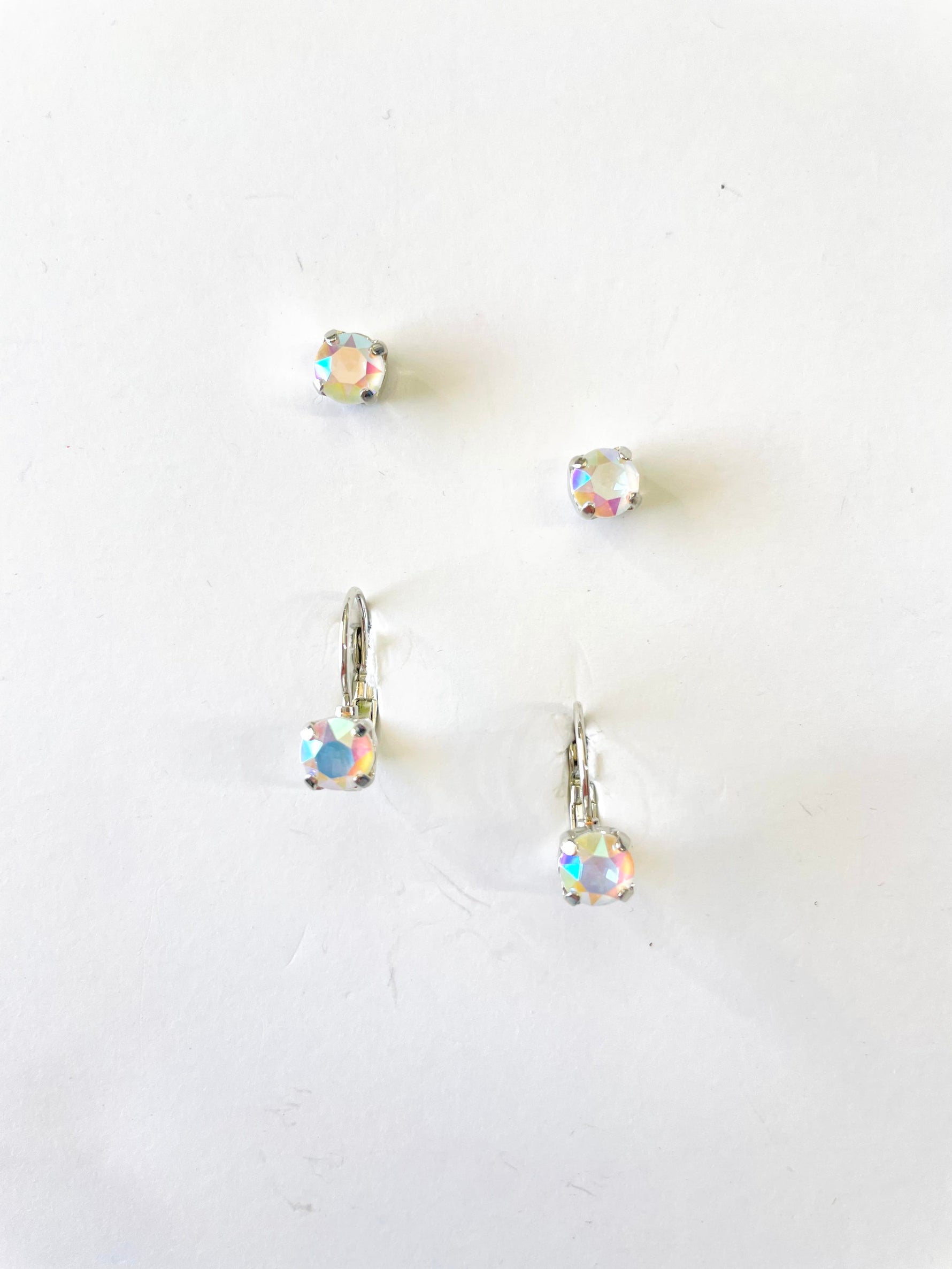 6mm Drop OR Post in Ultra White Lacquer AB set into Silver Plated Metal.