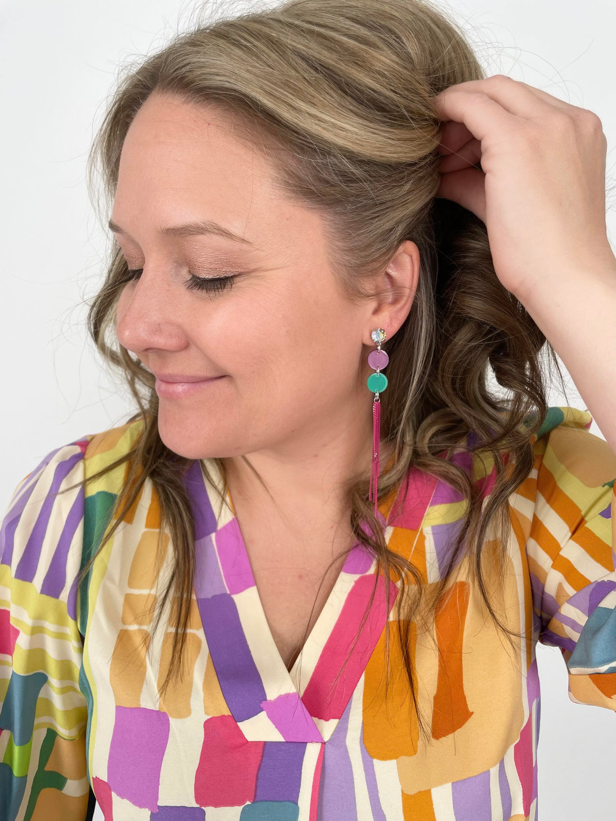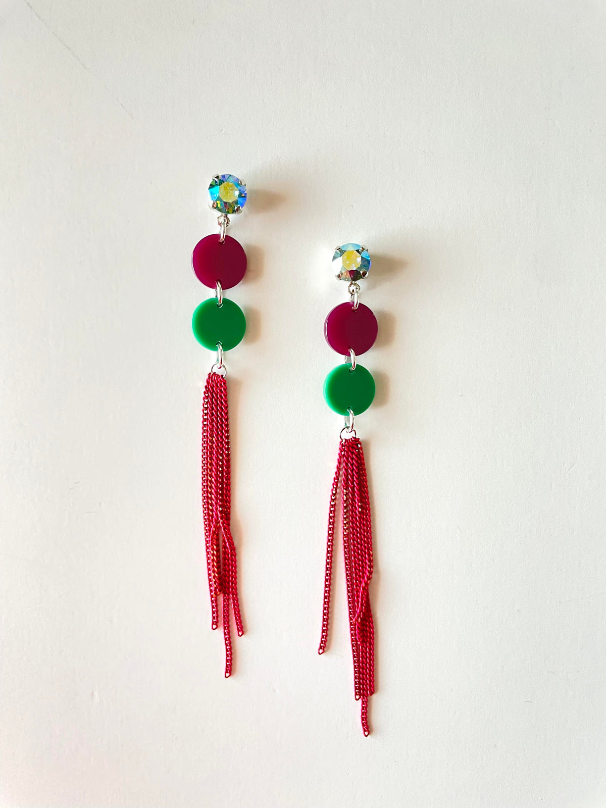 Abstract Polka Dot Earring set into Shiny Silver Metal with Light Sapphire AB and Lightweight Pendants in Purple and Green with Lightweight Pink Chain Fringe.