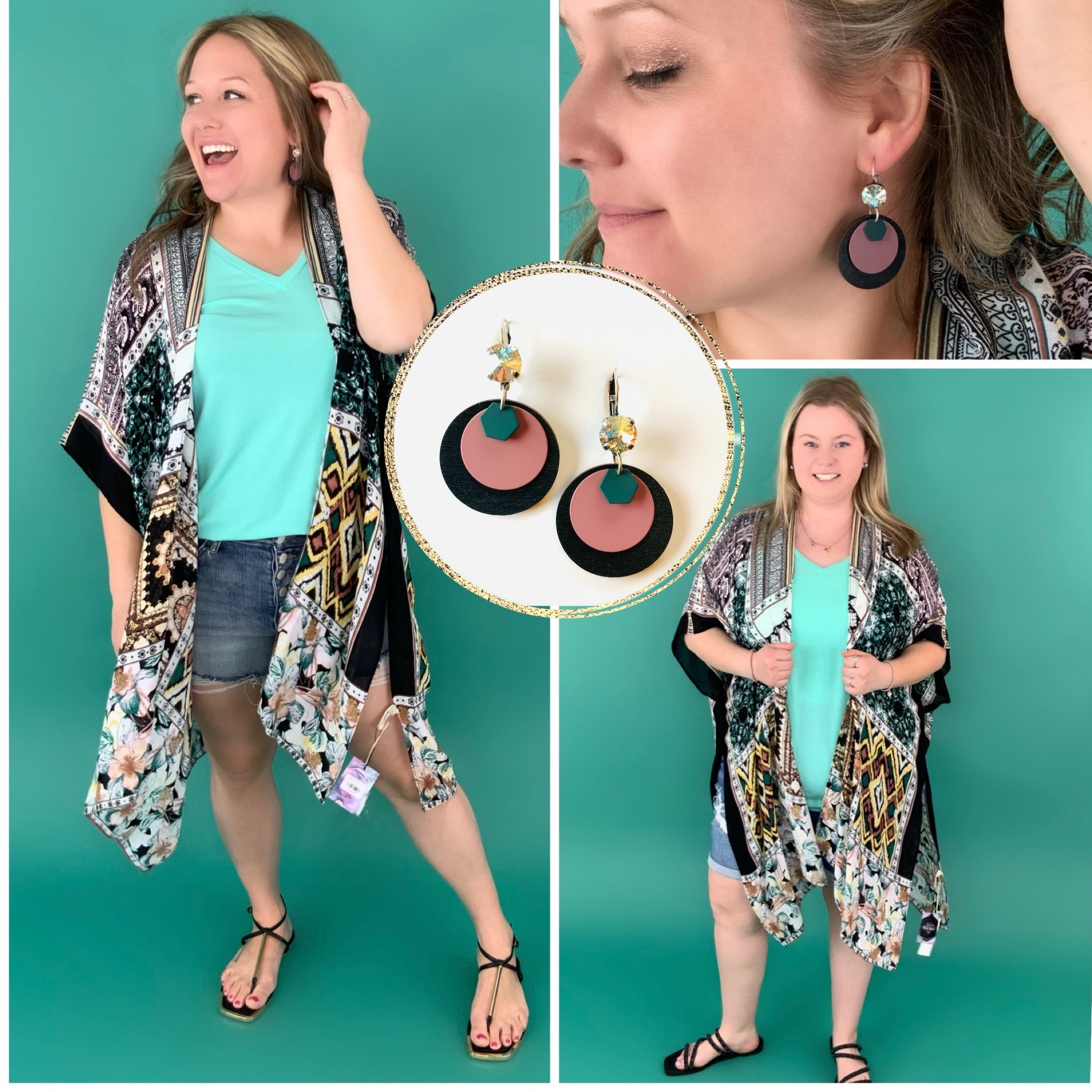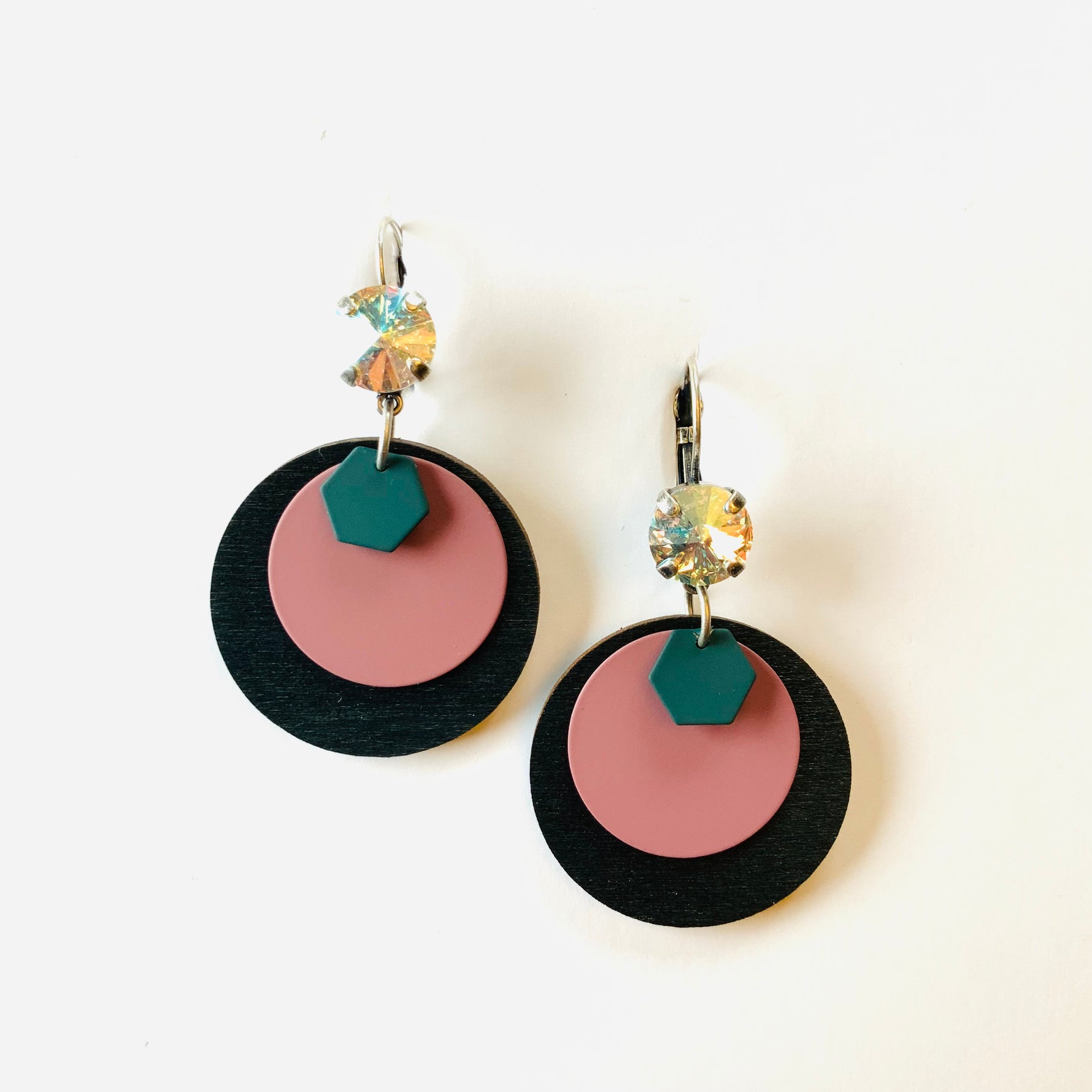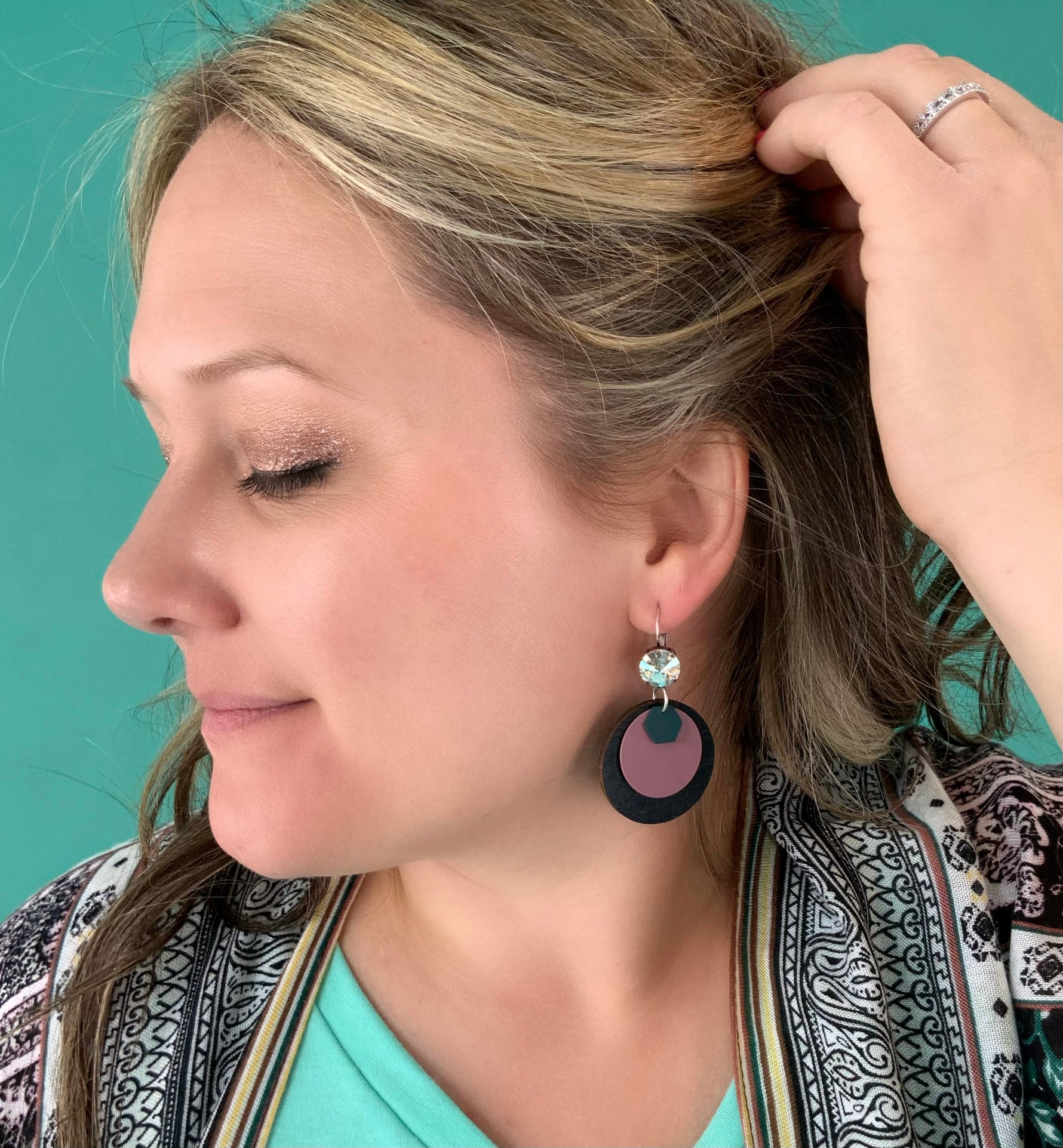 Always Dreaming Earrings set into Antique Silver Metal with Crystal Shimmer Crystals and Black Wood Charm with Matte Mauve and Teal Pendants