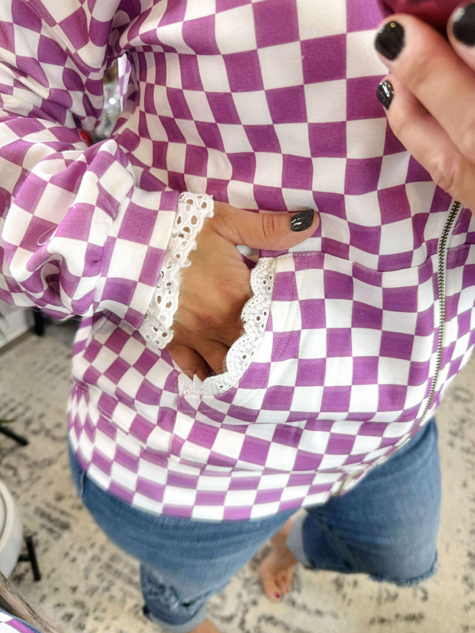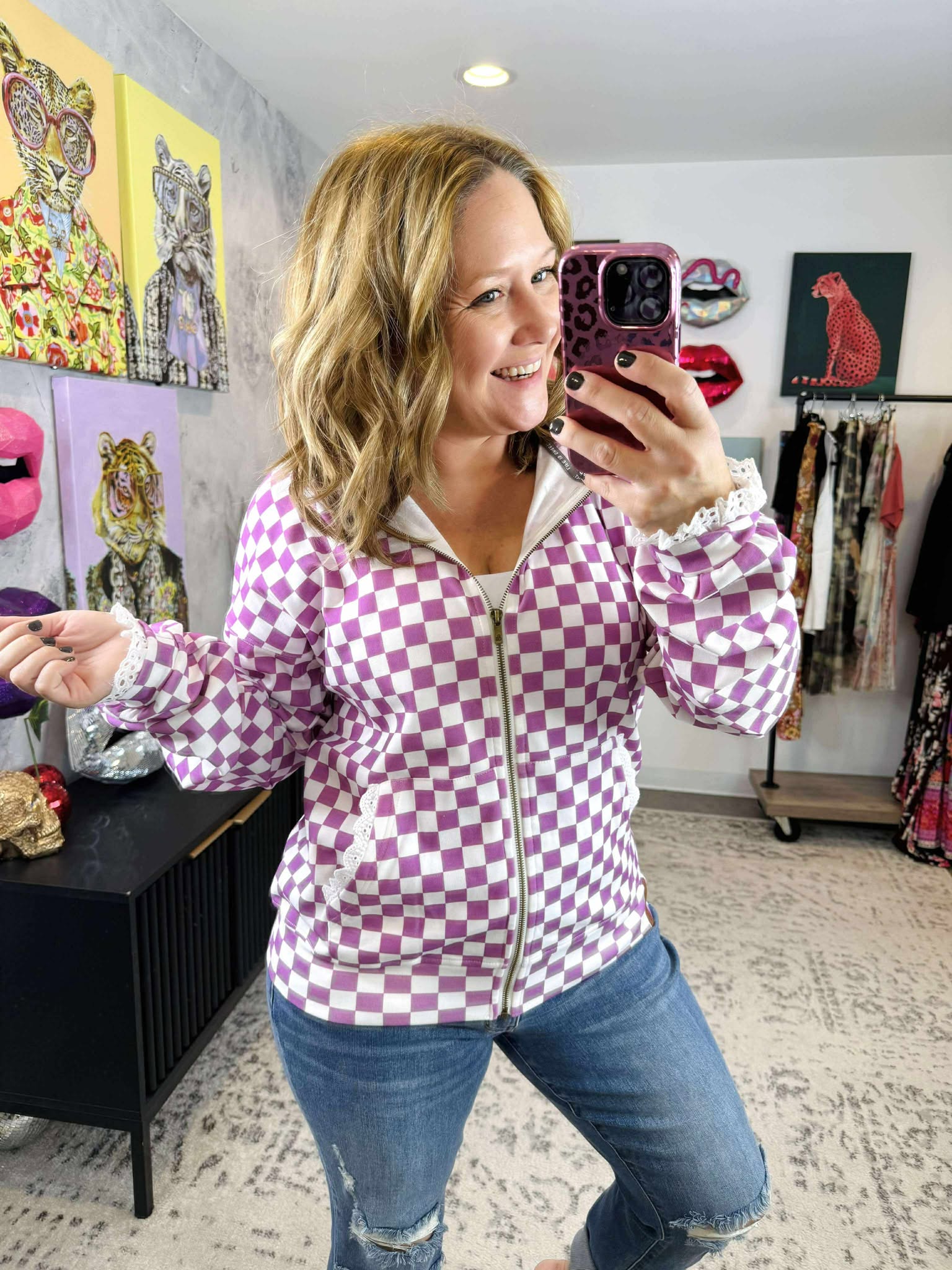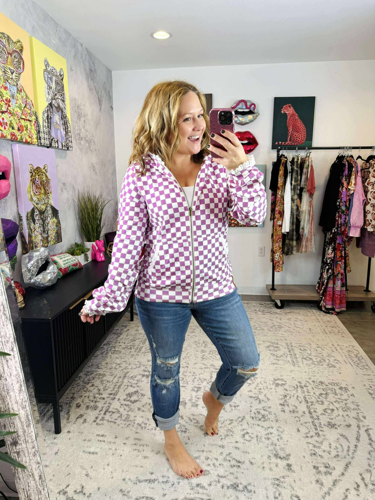 This lace-trimmed full zip is your new favorite layer—equal parts comfy and cute. With soft fabric, a relaxed fit, and delicate lace details, it adds a girly twist to your everyday zip-up. Perfect for coffee runs, cozy nights in, or just feeling a little extra pretty on the go.