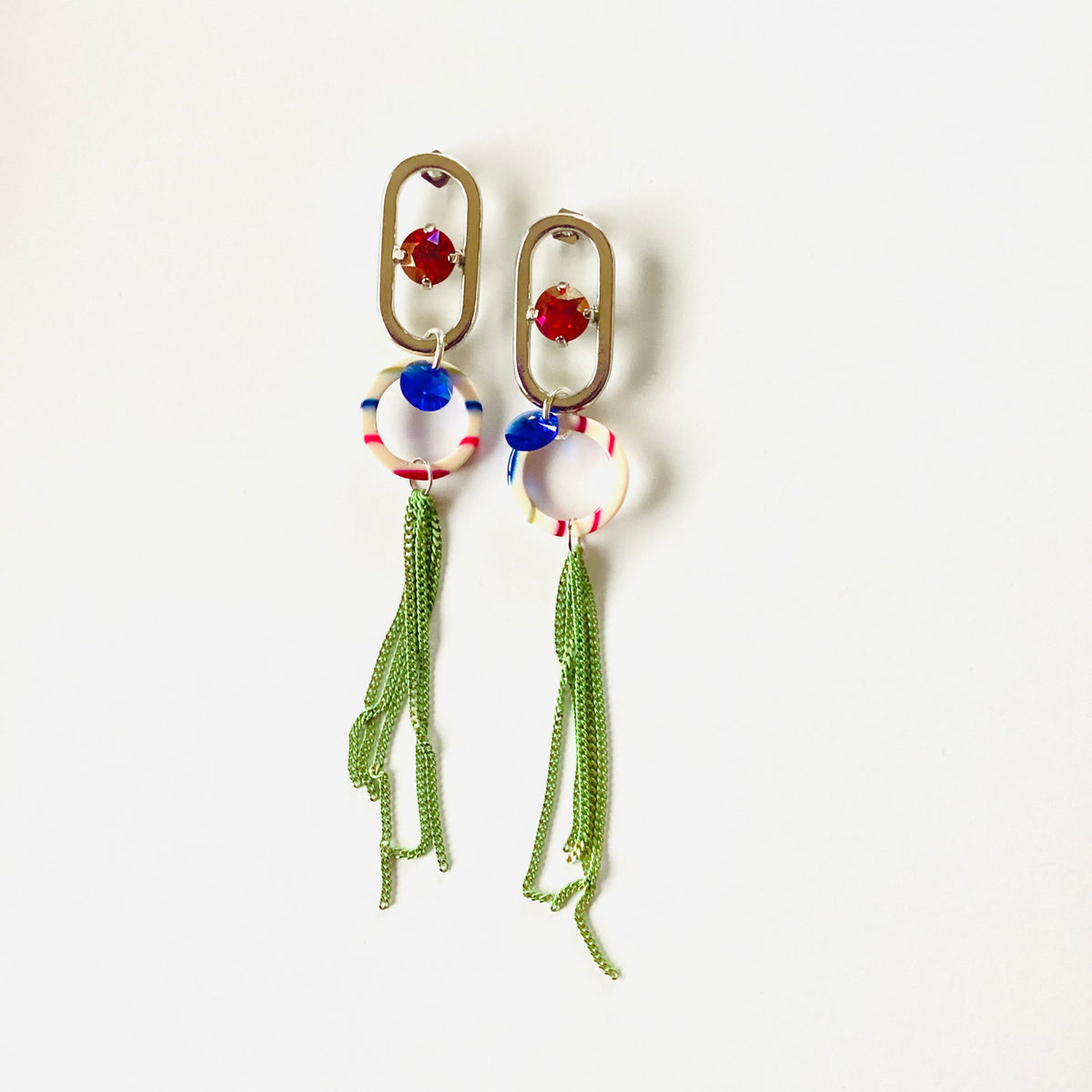 Artsy Earrings in Light Siam Lemon set into Shiny Silver Metal with Multi-Color Resin Striped Link, Green Chain Fringe, Majestic Blue Crystals.