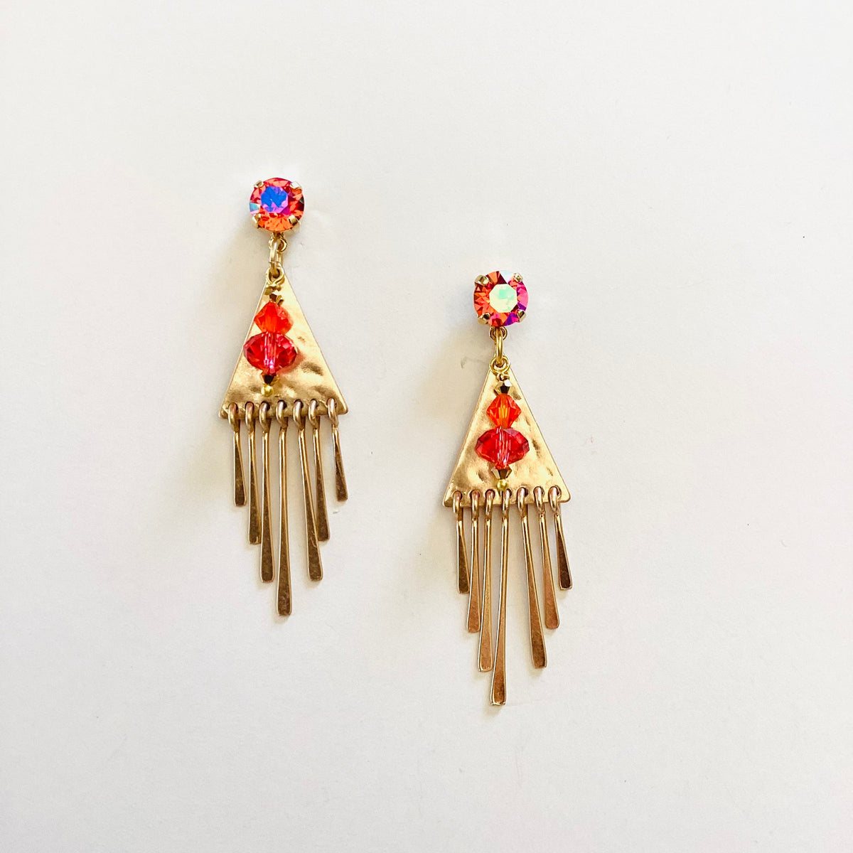 Aztec Charm Earrings set into Gold Metal with Padparadscha Glacier Blue and Lightweight Gold Metal Fringe Pendant