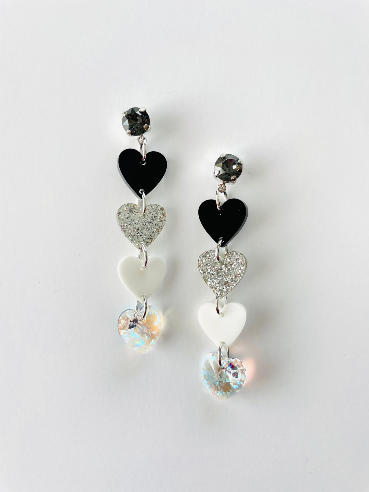 Be Mine Heart Earrings in Pink set into Shiny Silver Metal with Shades of Black/White Acrylic Hearts and Crystal Shimmer Crystals with Silver Night Posts.