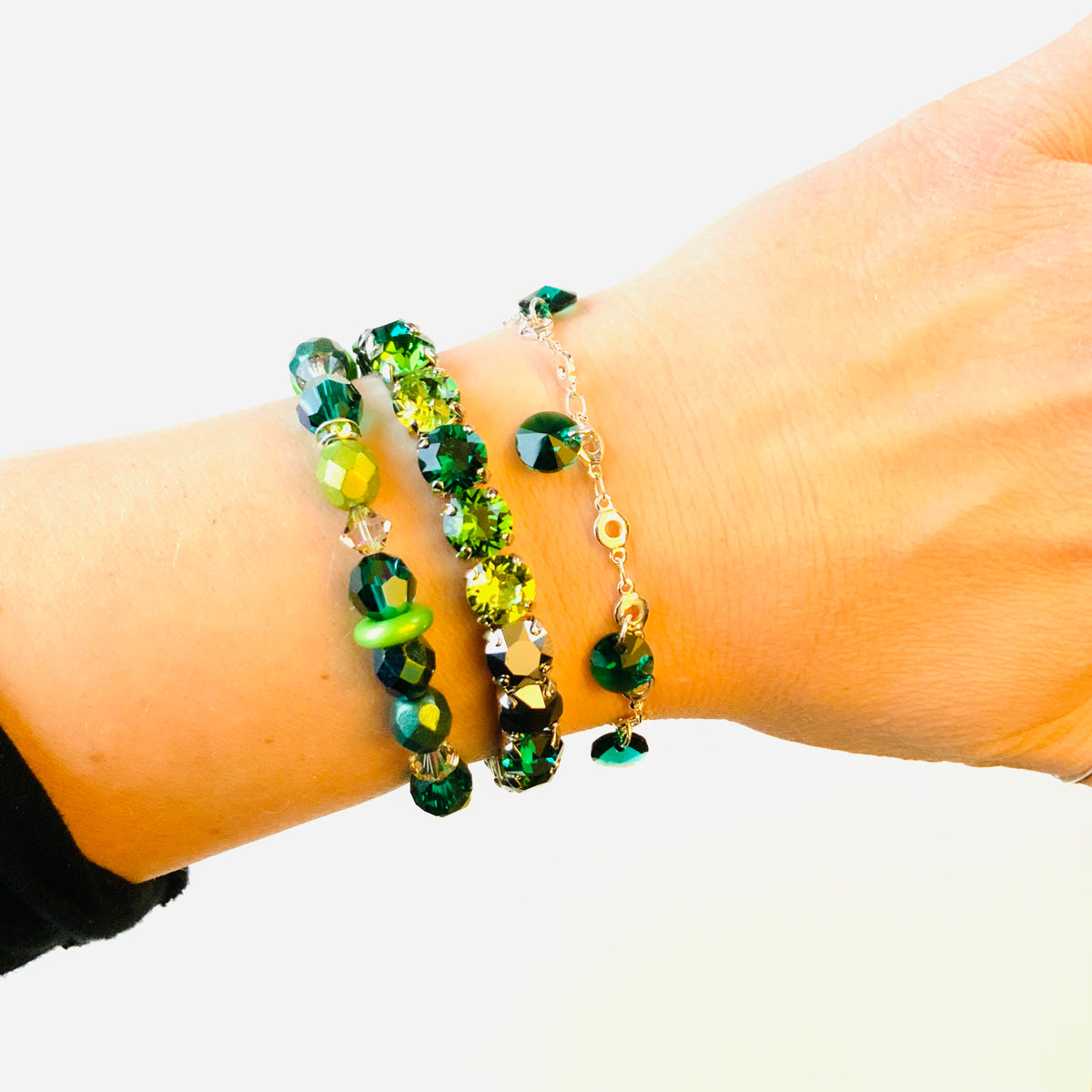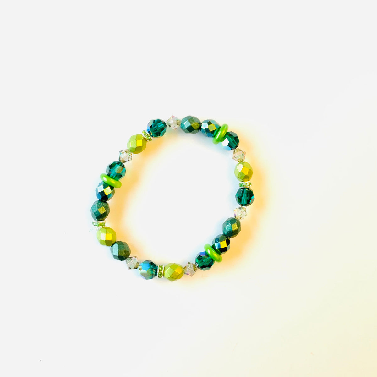 Beaded Stretch Bracelet in Green Hues with pops of Emerald AB, Paradise Shine, Green Matte Fire Polished Beads, with Peridot Rhinestones