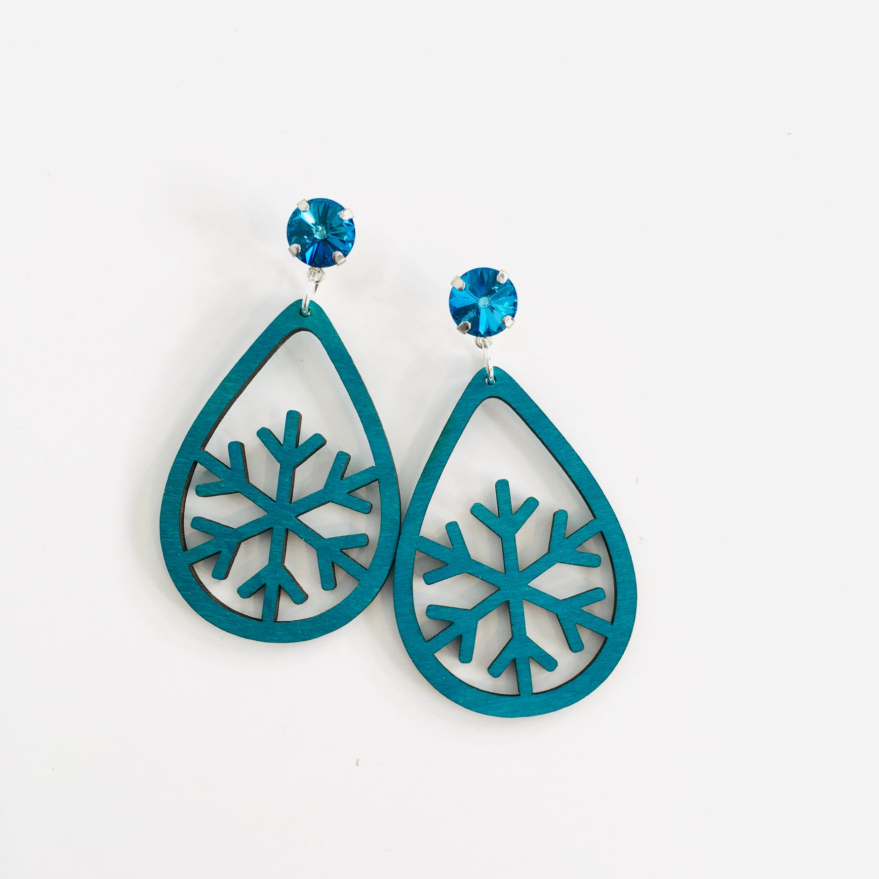 Snowflake Wood Earrings set into Shiny Silver Metal with Bermuda Blue Crystals