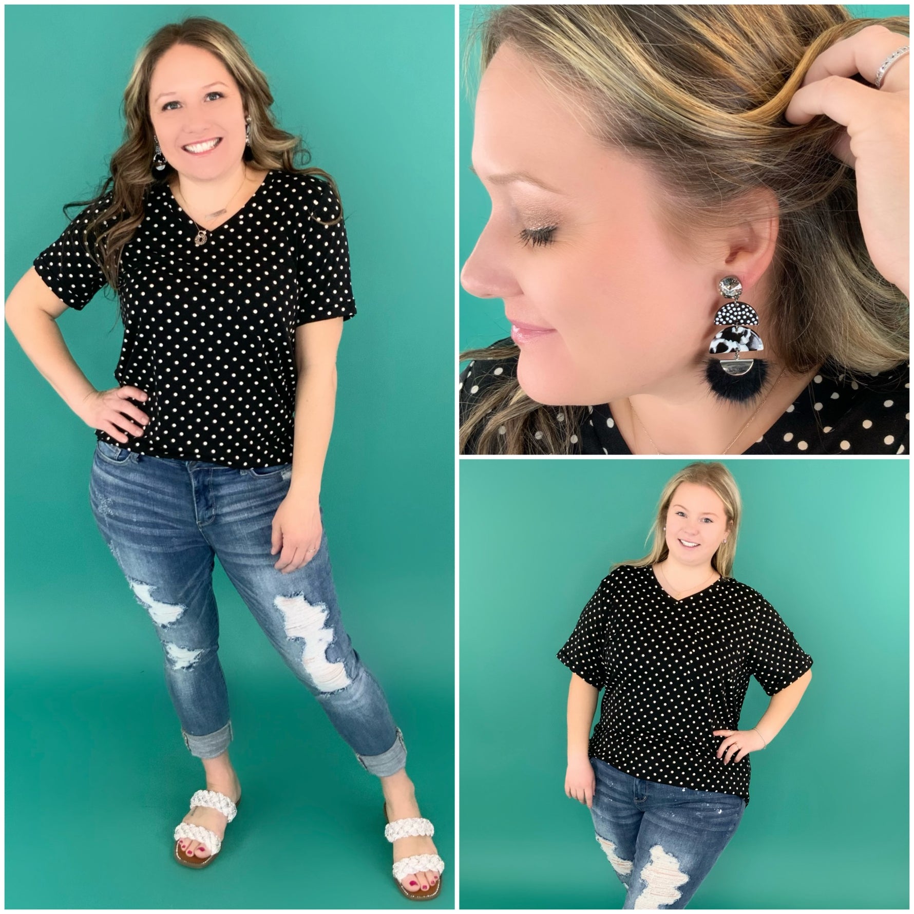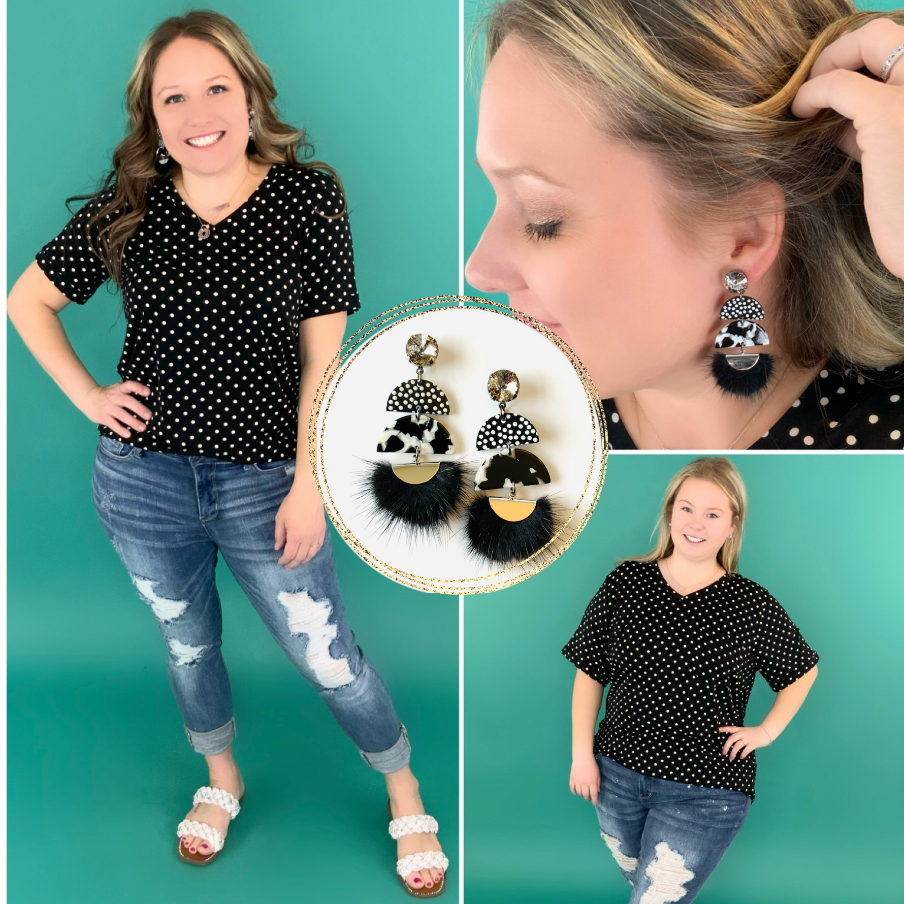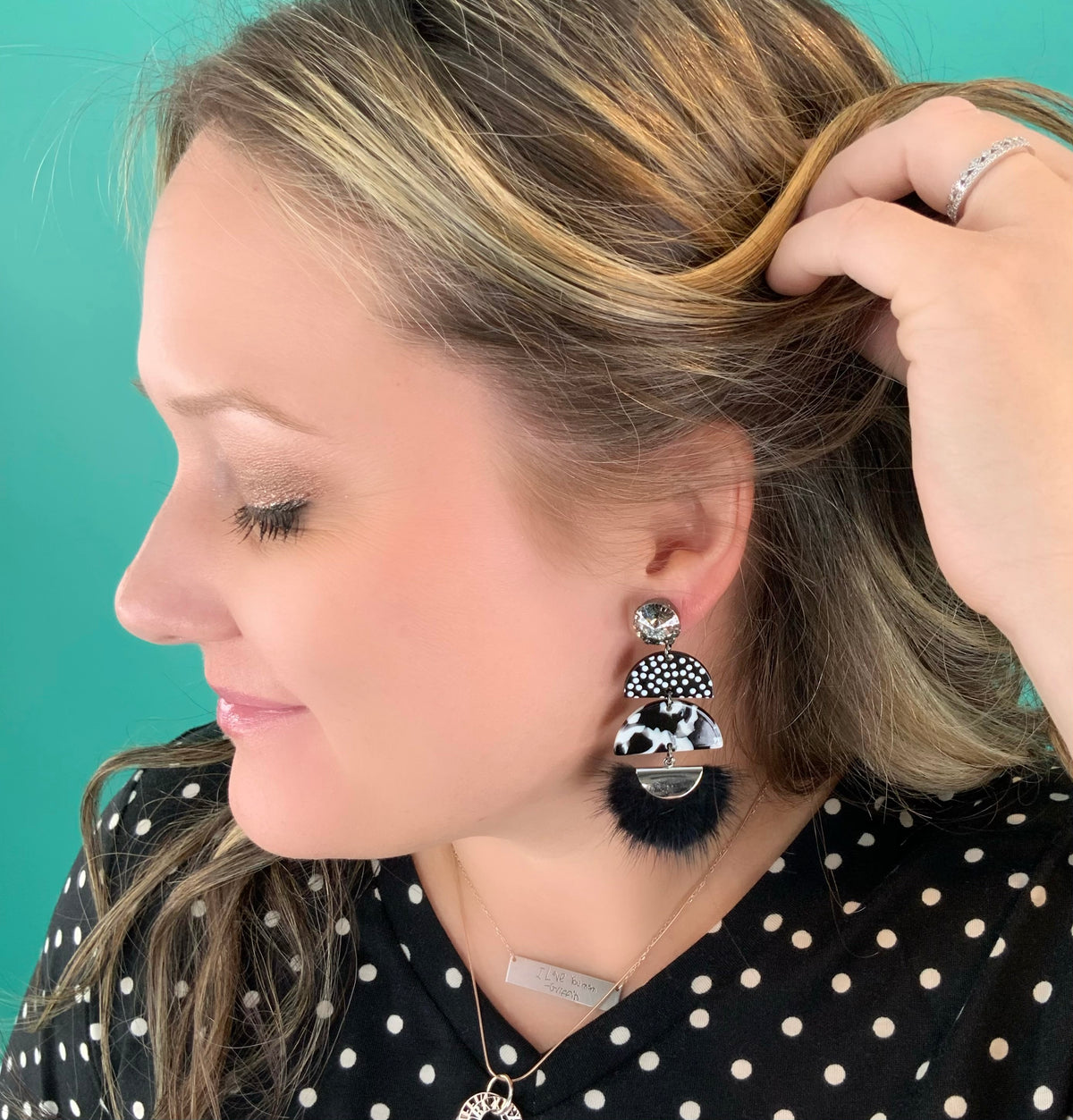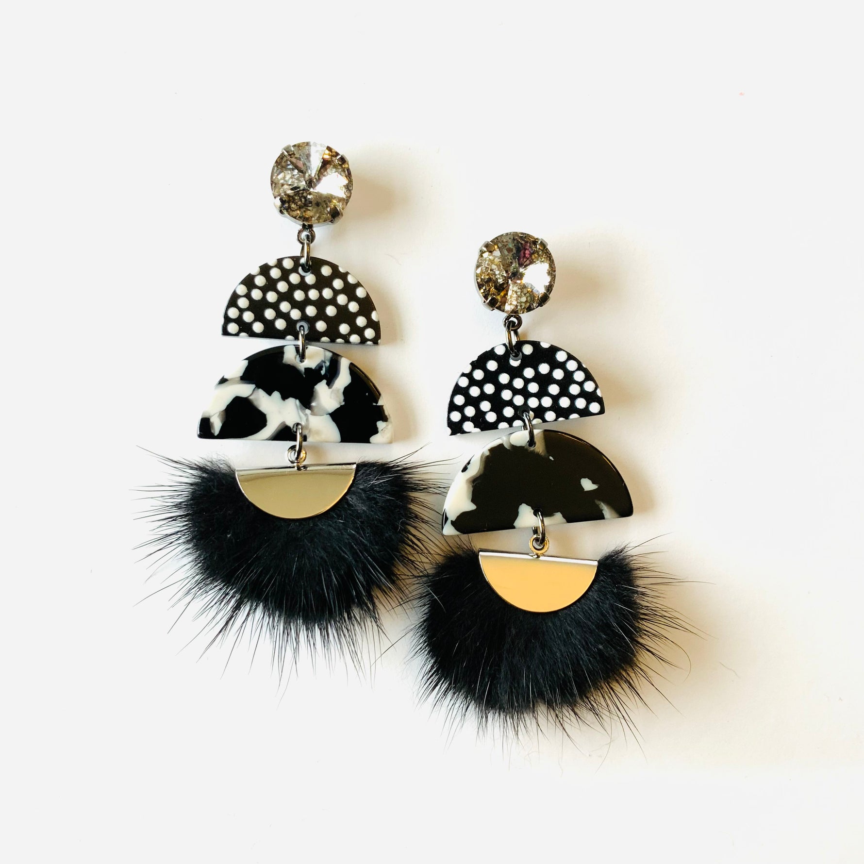 Black + White Polka Dot Faux Fur Earrings set into Shiny Silver Metal with Black and White Marble Look Pendant and Black/White Polka Dot Pendant with Silver Patina Crystals and Lightweight Faux Fur Pendant in Black