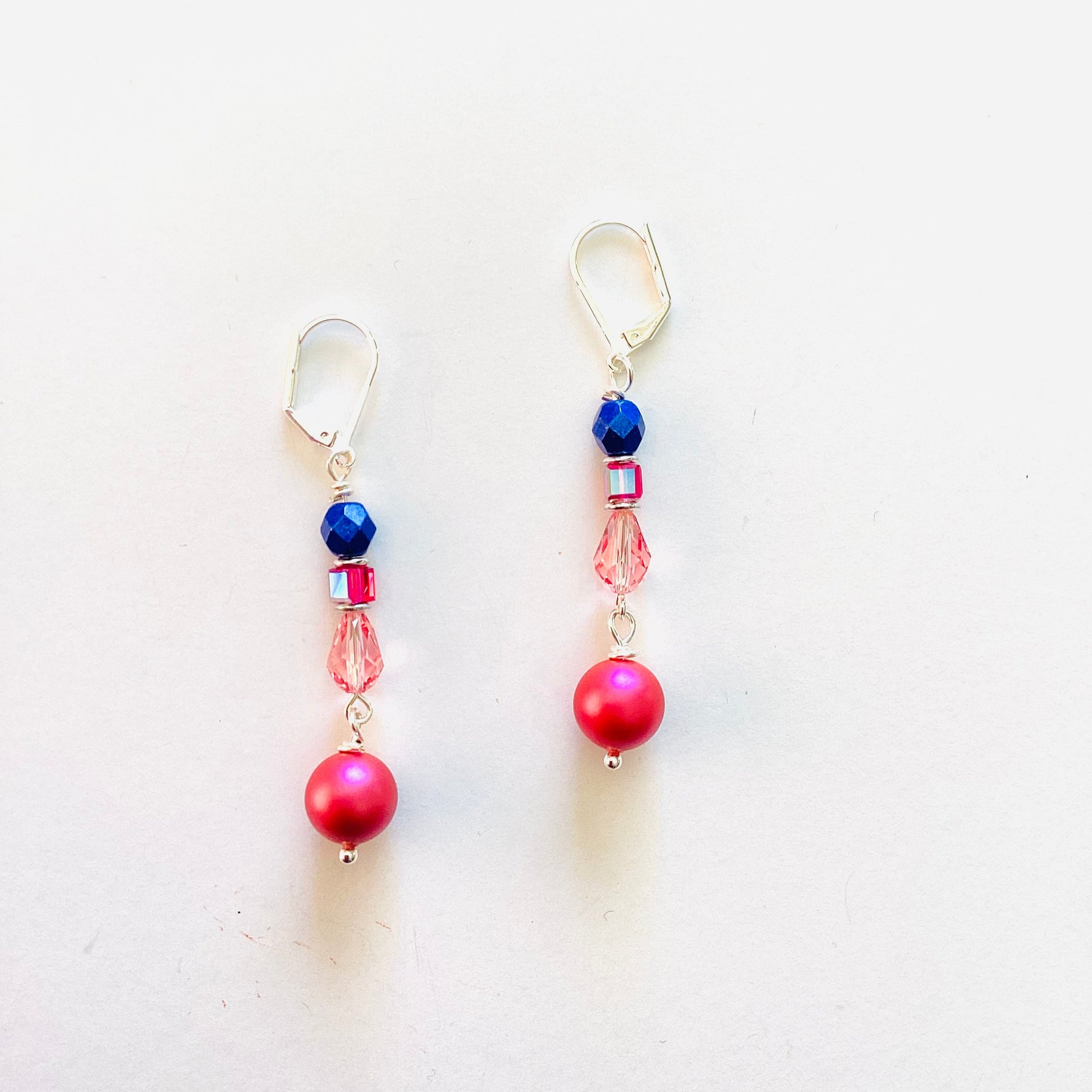 Boho Bliss Earrings set into Shiny Silver Metal with Pink Pearls, Rose Teardrop Crystals, Fuchsia AB Crystals and Blue Fire Polished Beads.
