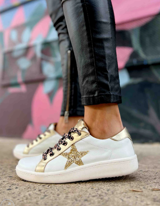 Introducing the BRISA sneaker in a dazzling white and gold colorway. These kicks add a touch of glam to any outfit without sacrificing comfort. Perfect for those who want to make a statement and keep their feet happy!