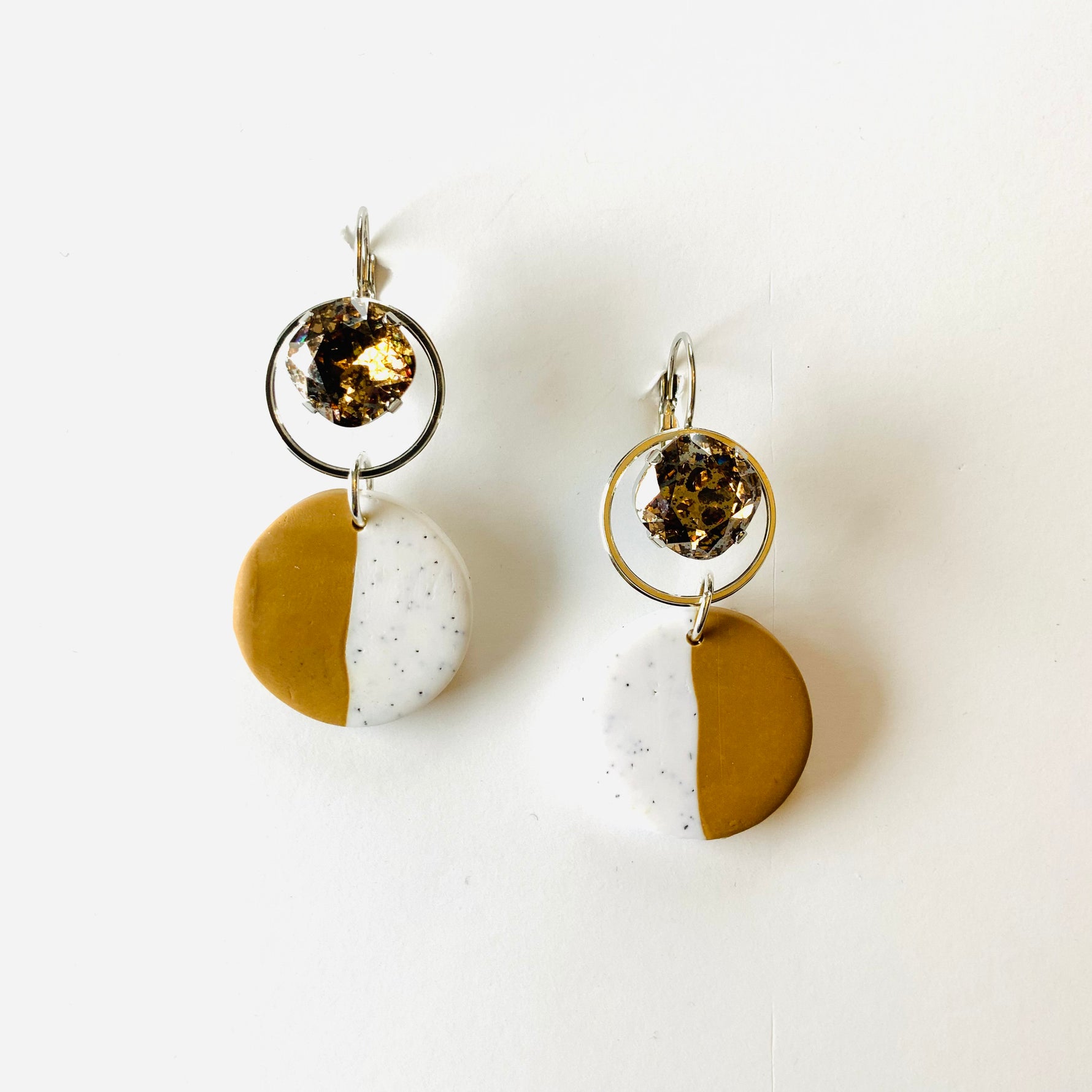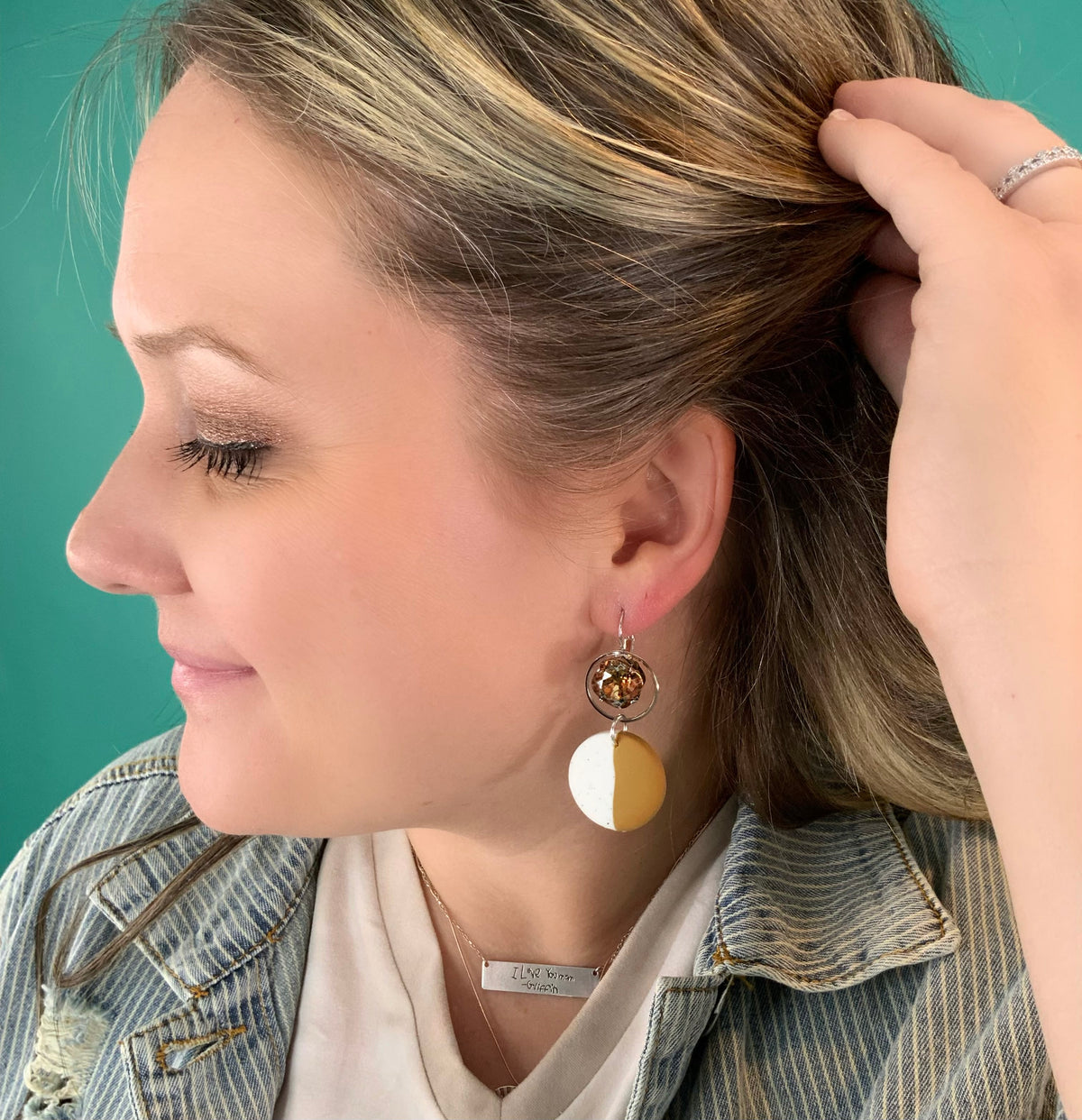 Chic + Sweet Caramel Drop Earrings set into Shiny Silver Metal with Light Colorado Topaz Silver Patina and Polymer Clay Pendant