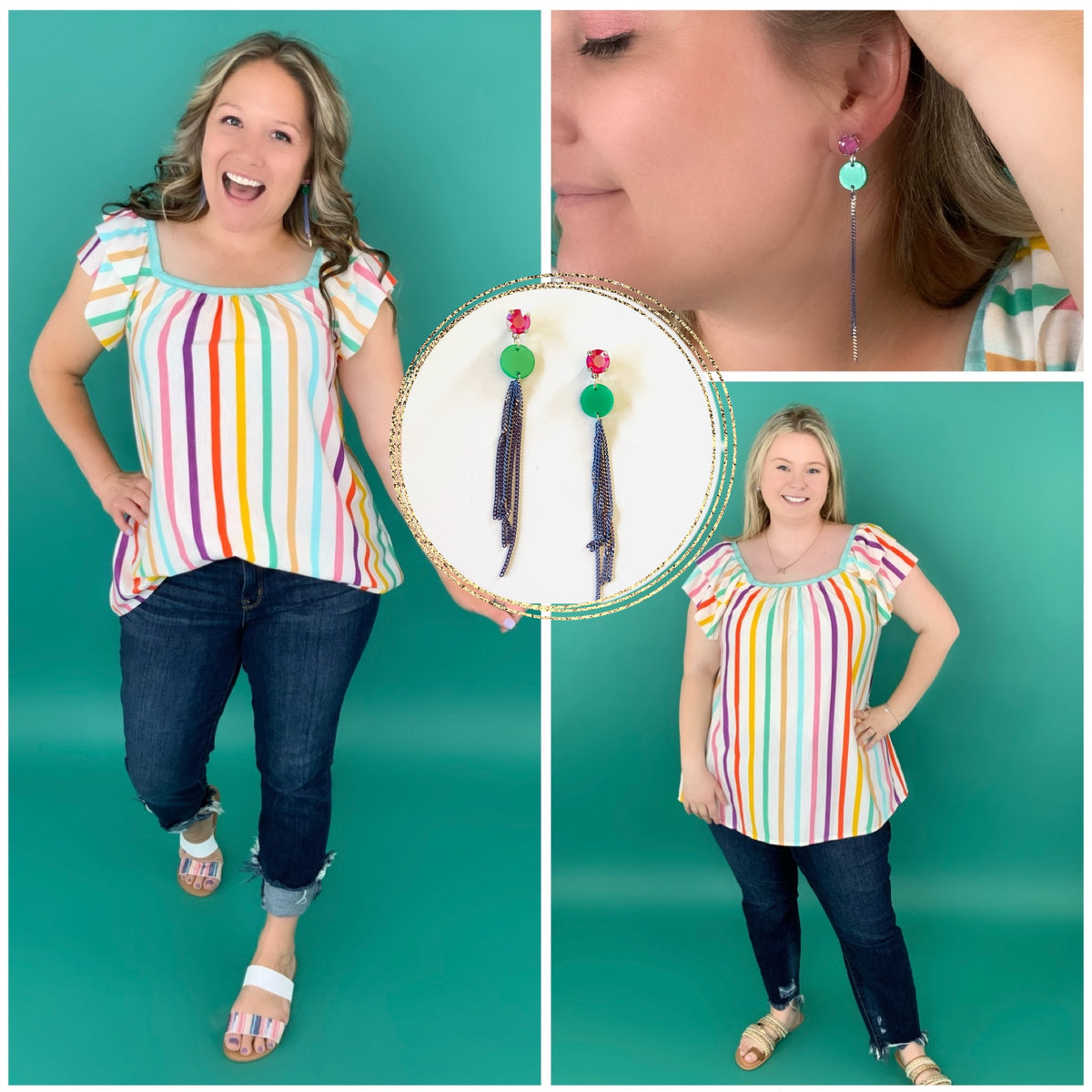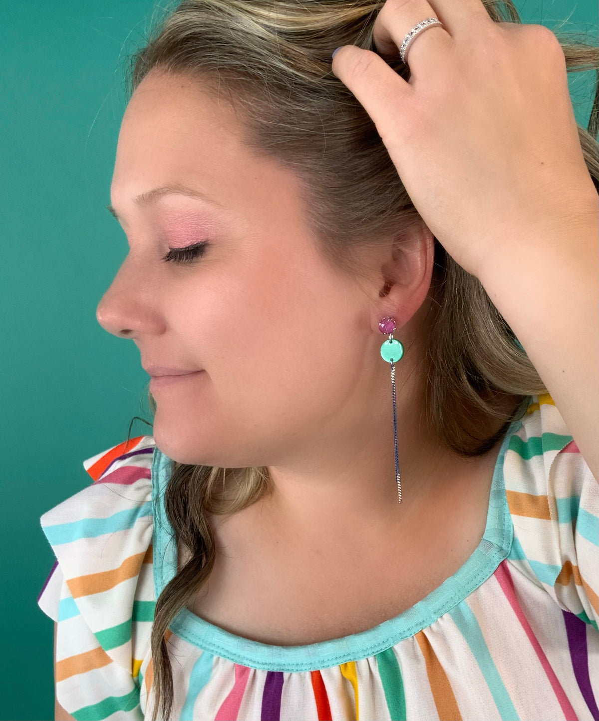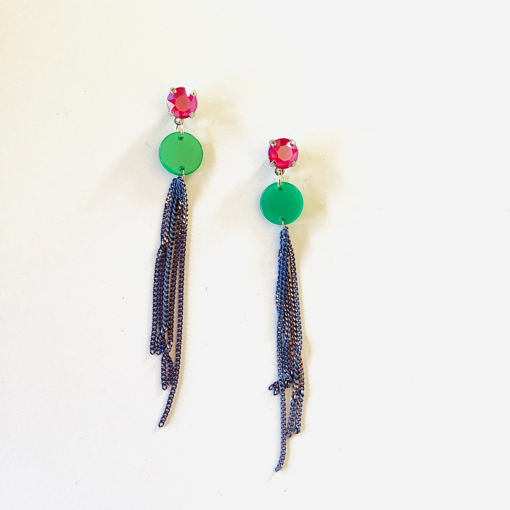 Color My World Earrings set into Shiny Silver Metal with Green Pendant and Purple Chain Crystals in Peony Lacquer