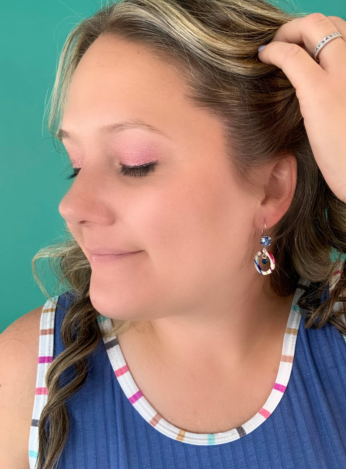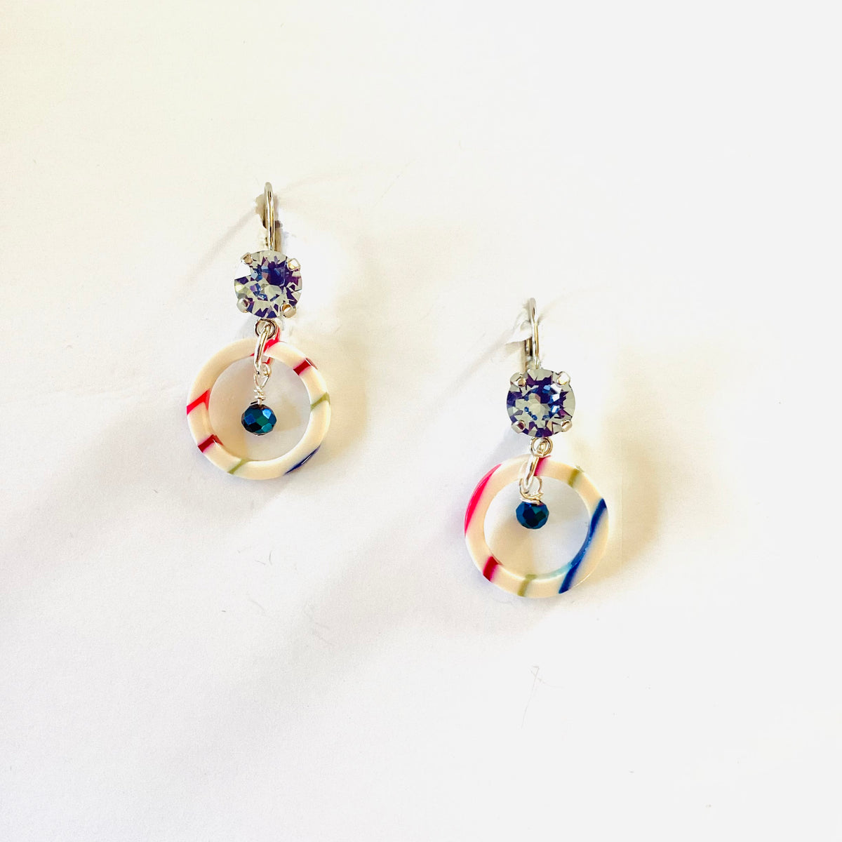 Colorful Stripe Drop Earrings set into Shiny Silver Metal with Light Sapphire Crystals, Small Blue Gemstone, and Colorful White Pendant.