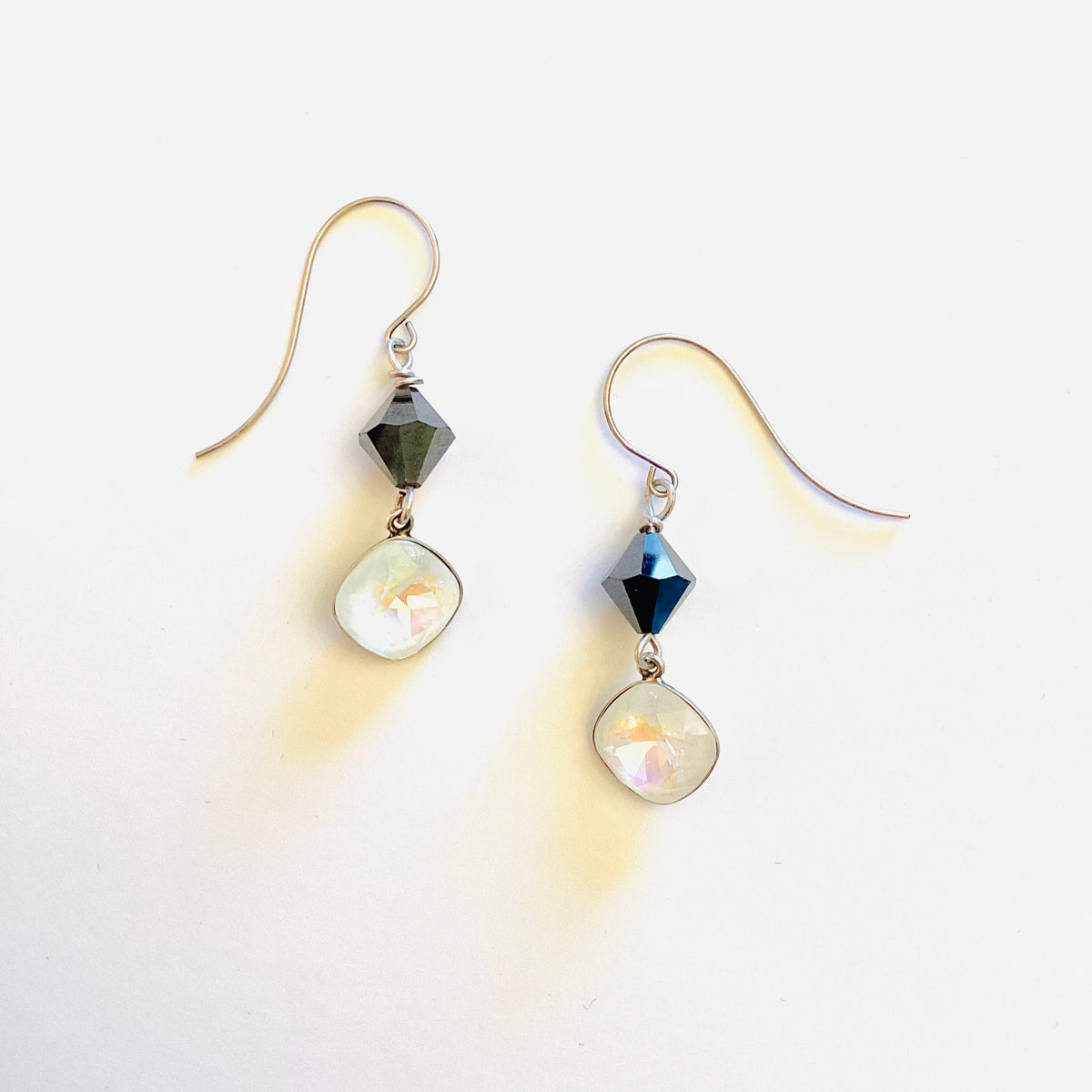 Into the Night Drop Earrings set into Antique Silver Metal with Jet Hematite Crystals and White DeLite Crystals.