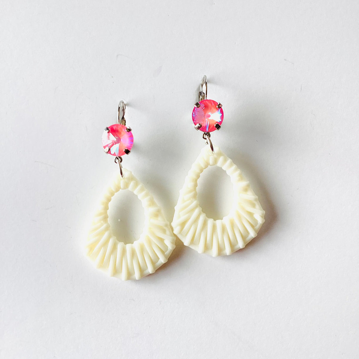 Woven White Pink Earrings set into Shiny Silver Metal with Ultra Peony Pink Crystals and a Woven White Resin Pendant.