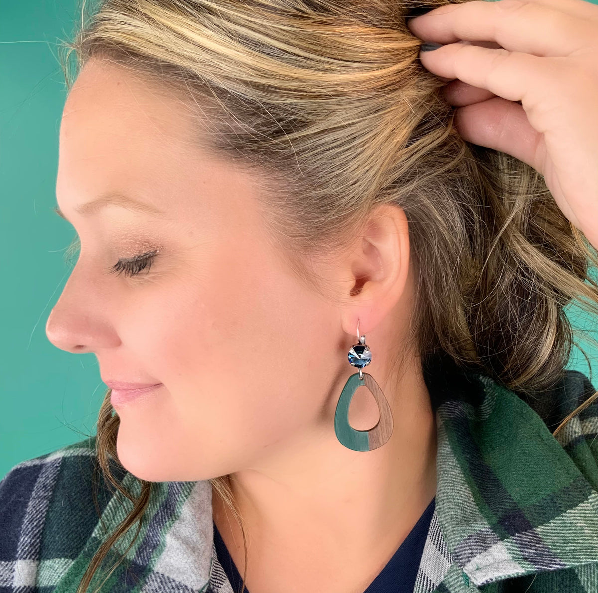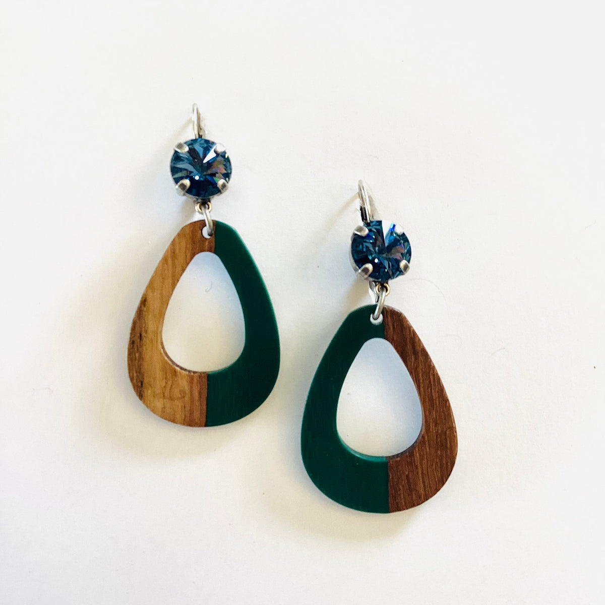 Forest Green Wood Earrings set into Antique Silver Metal with Denim Blue Crystal and Lightweight Dark Green/Wood Pendant