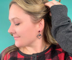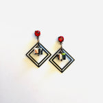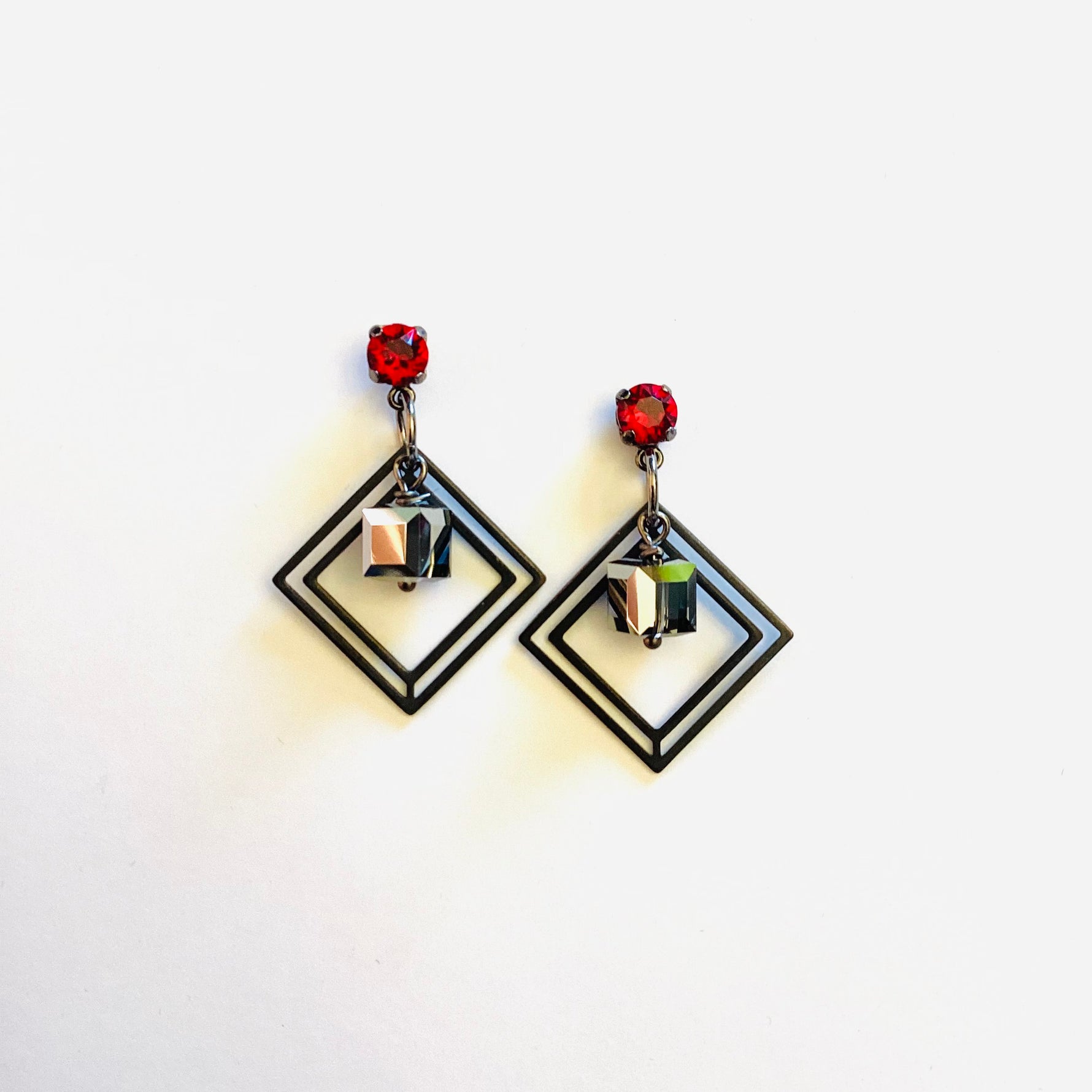 Cozy Up Earrings set into Black Metal with Silver Night Cube Crystals and Siam Crystals.