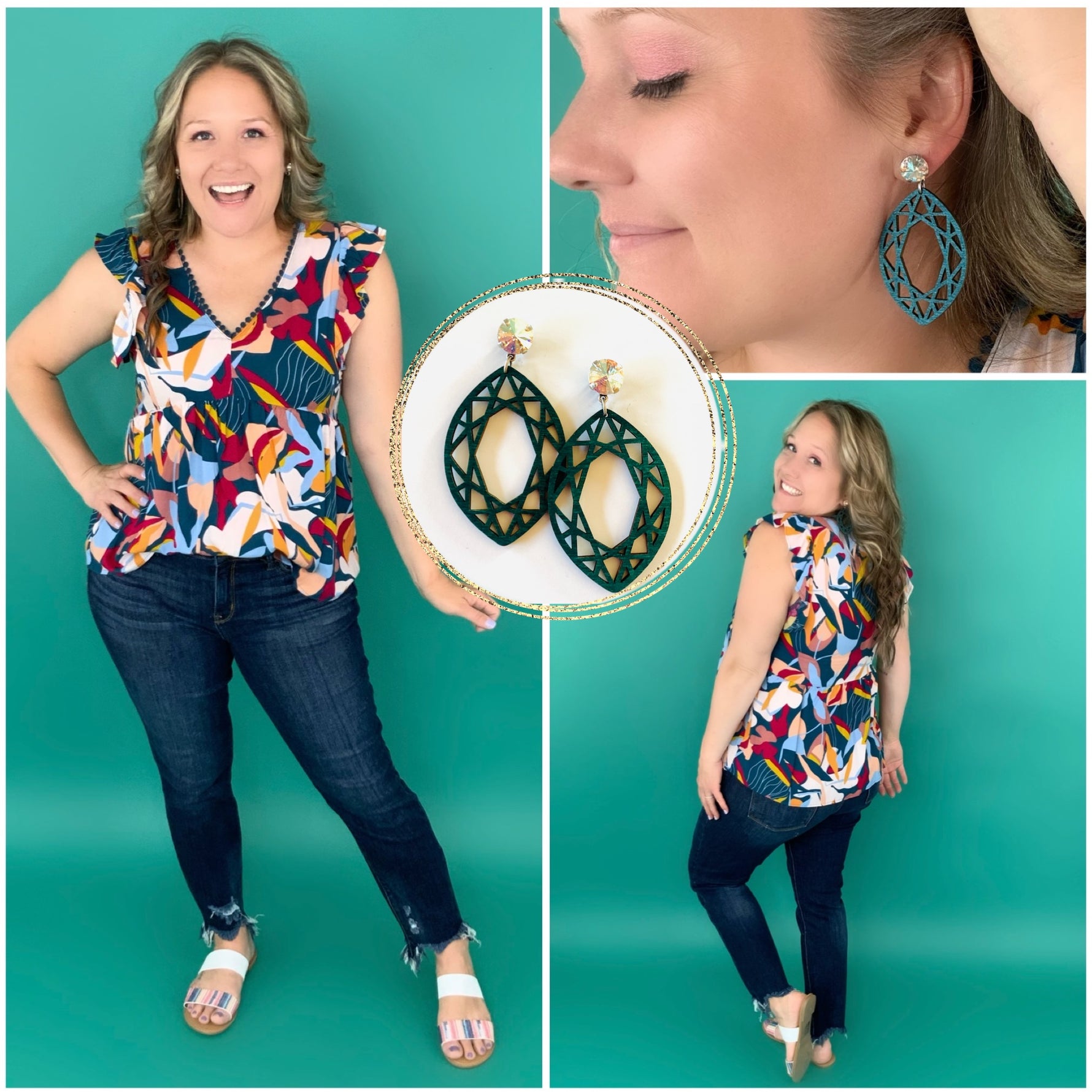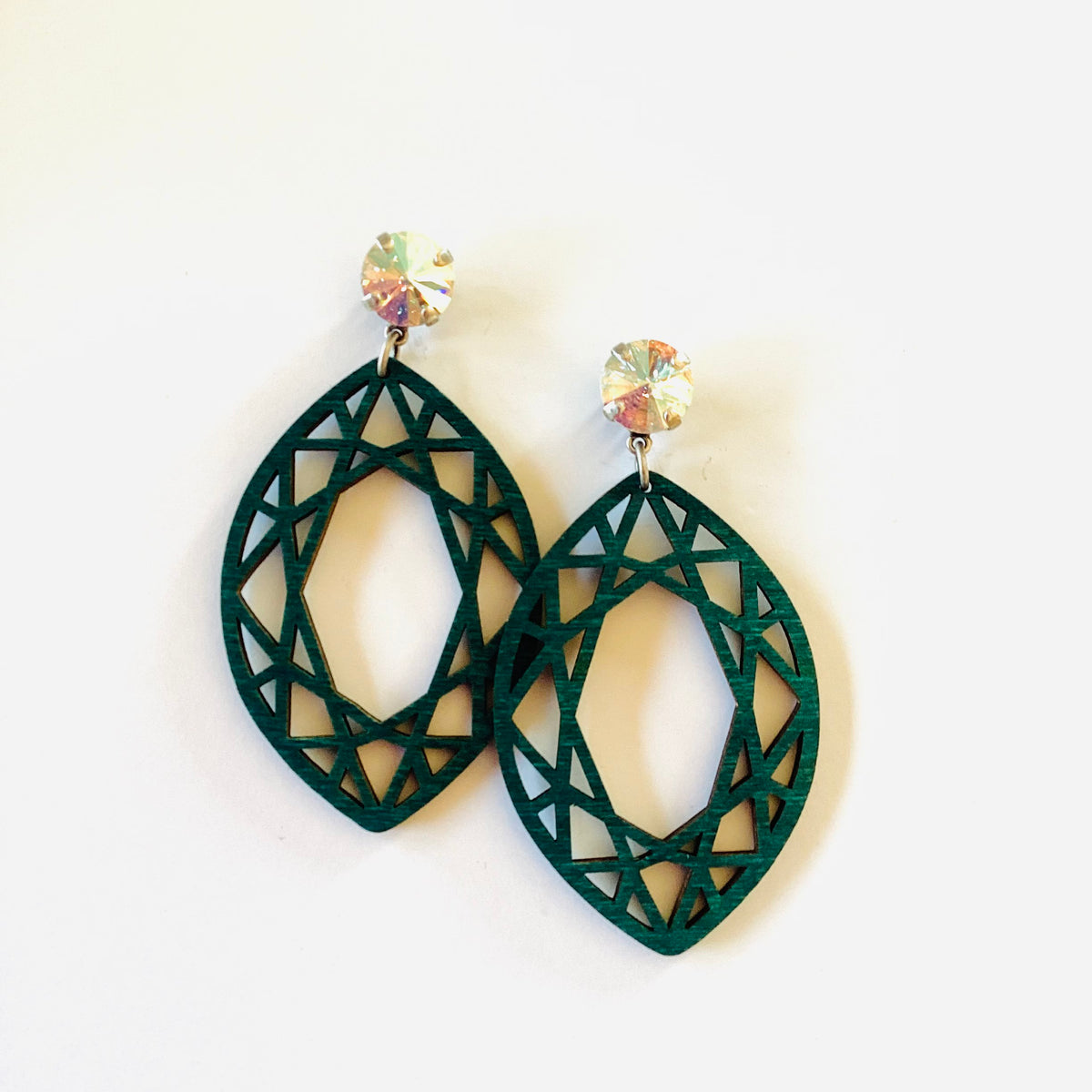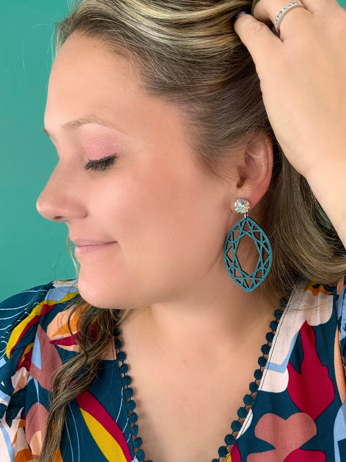 Crystal Shimmer Teal Wood Earrings set into Antique Silver Metal with Teal Oval Laser Cut Pendant