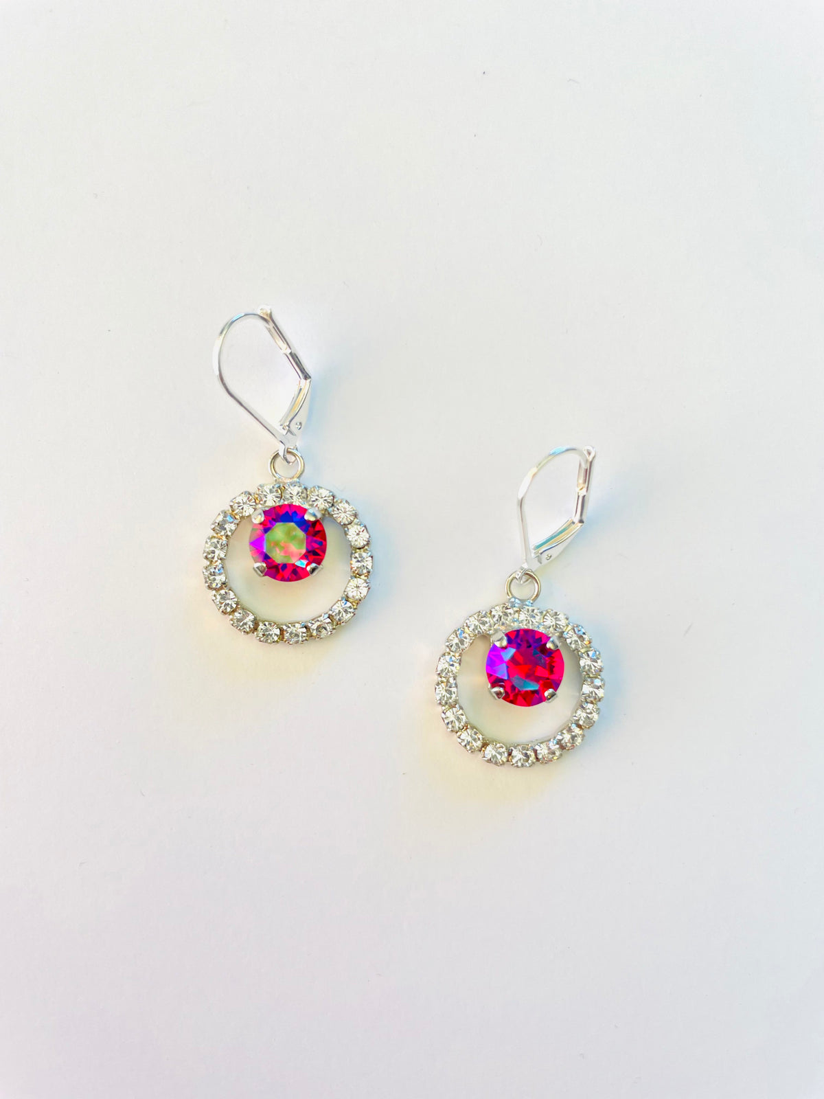 Daisy Halo Earrings in Fuchsia AB set into Shiny Silver Metal.