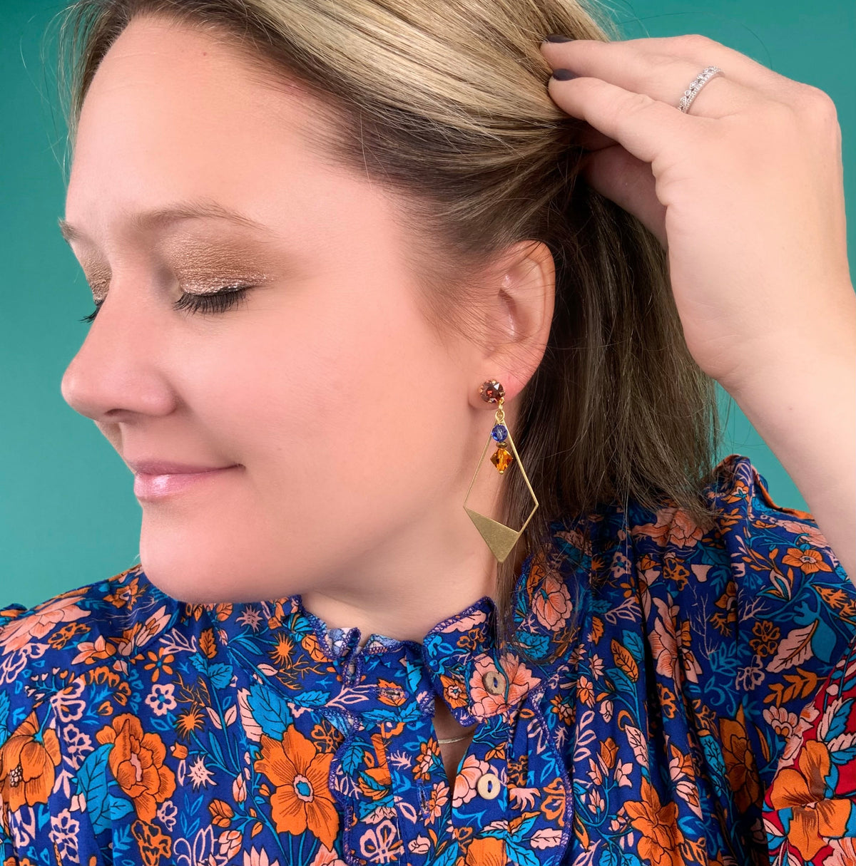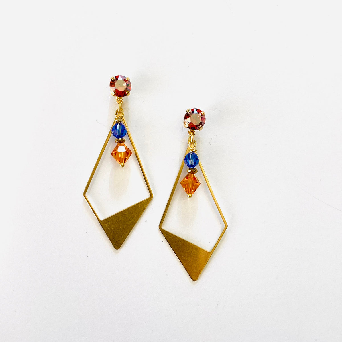 Days Gone By Earrings set into Gold Metal with Copper Custom Coated Crystals with Caramel and Sapphire Crystals. Gold Pendant Link.