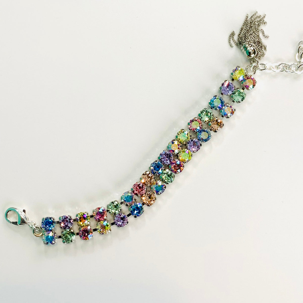 Double Diamonds Bracelet in Pastel Hues set into Shiny Silver Metal. Light Rose, Light Rose AB, Light Peach, Jonquil, Jonquil AB, Chrysolite, Chrysolite AB, Light Sapphire, Light Sapphire AB, and Violet, Crystal AB