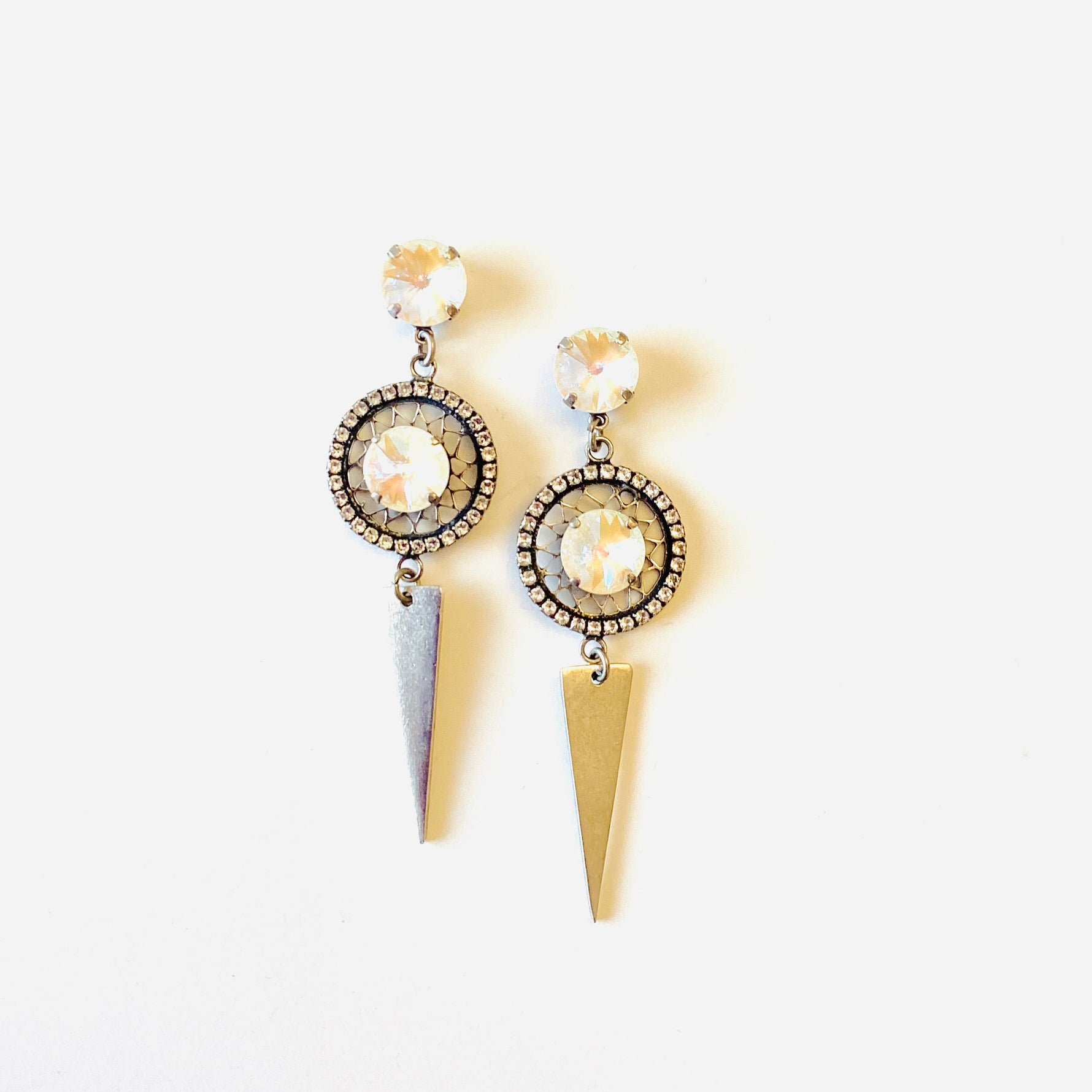 Dreamcatcher Spike Earrings set into Antique Silver Metal with White DeLite Crystals and Metal Spike Pendant.