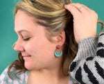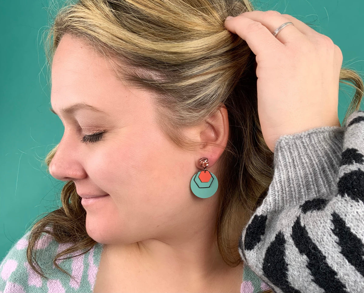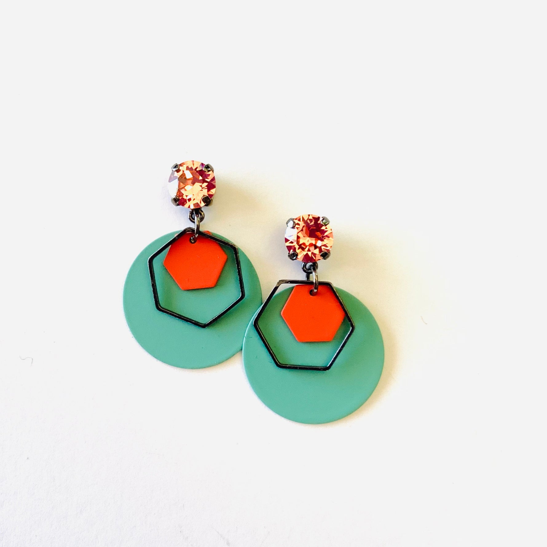 Fabulous At Its Finest Earrings set into Black Metal with Sage Green Matte Pendant, Orange Matte Pendant, and Black Link with Rose Peach Crystals.