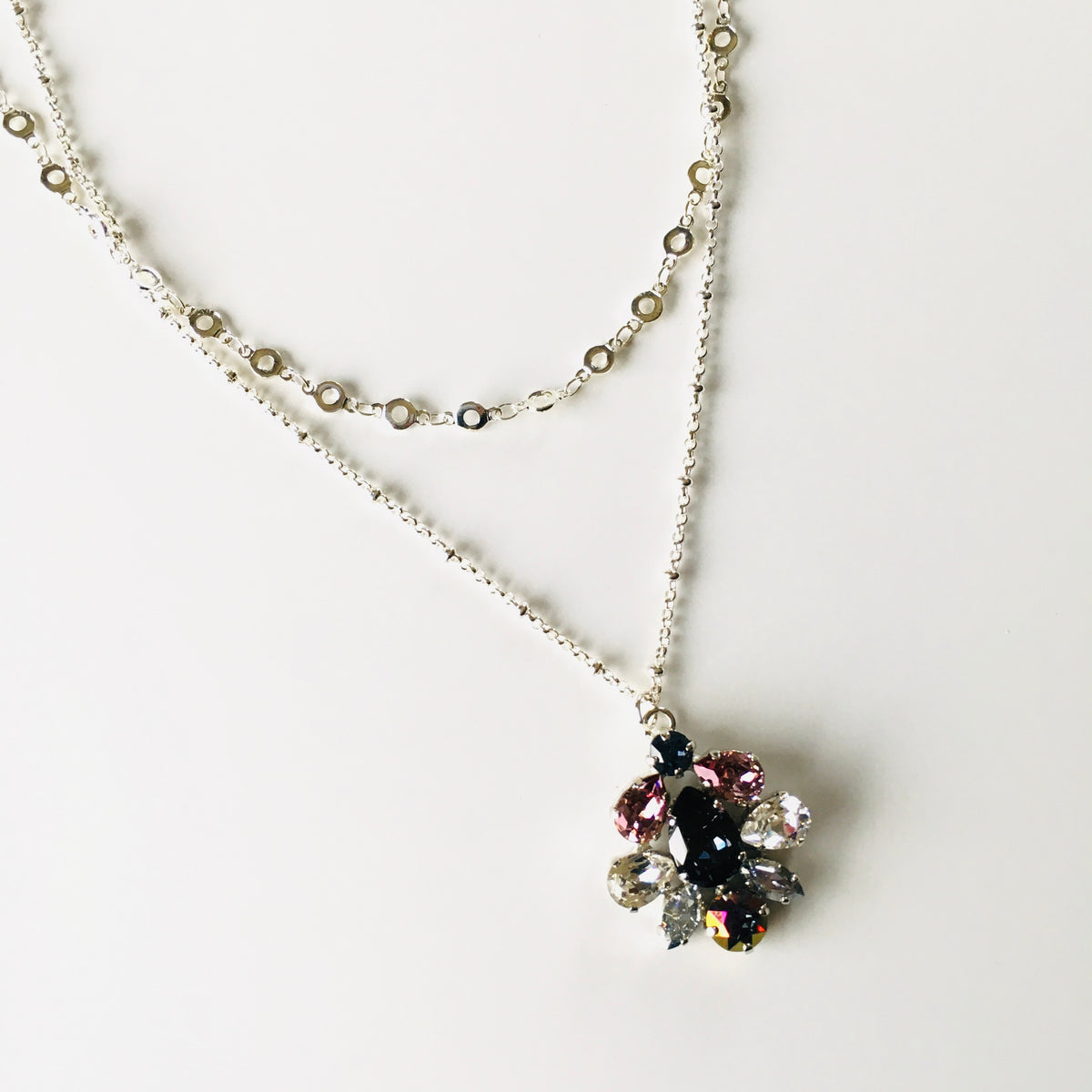 Charm Long Necklace featuring Sapphire Brandy set into Shiny Silver Metal, with pops of Purple, Blue, Fire Polished Beads, Diamond and Montana Crystals