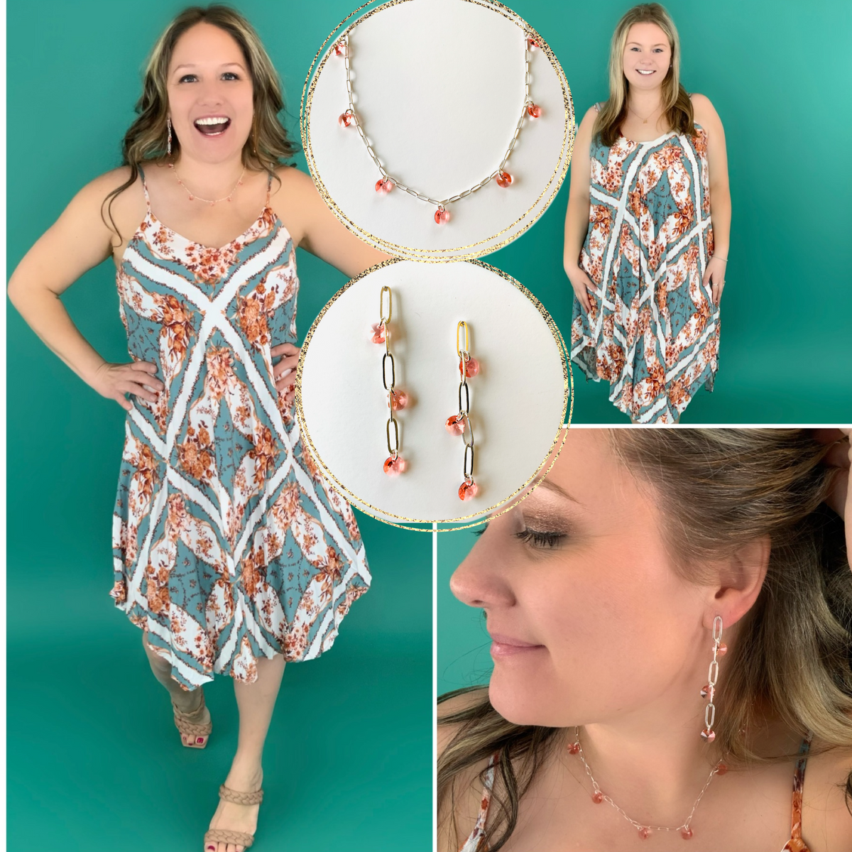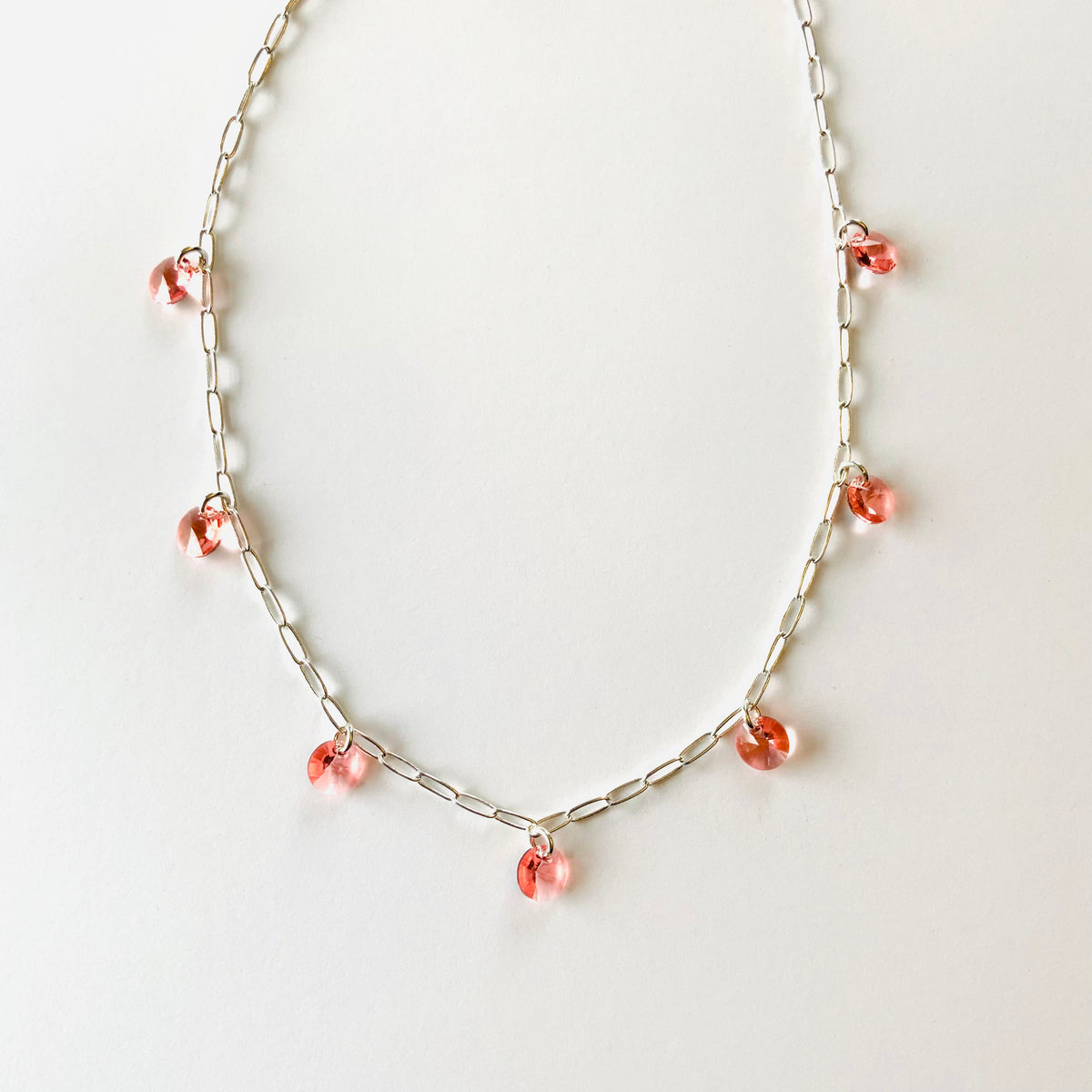 Feeling Peachy Charm Necklace set into Shiny Silver Metal with Rose Peach Crystals
