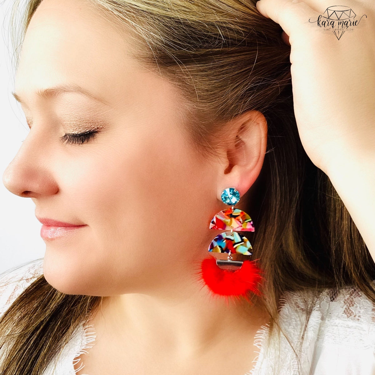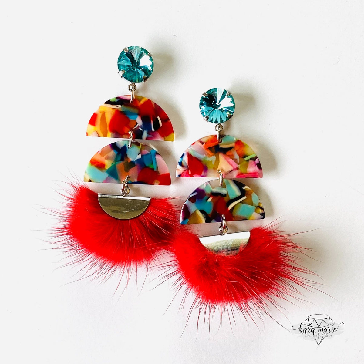 Fiesta Faux Fur Earrings set into Shiny Silver Metal with Colorful Resin Pendants, Light Turquoise Crystals and Lightweight Faux Fur Pendant in Red