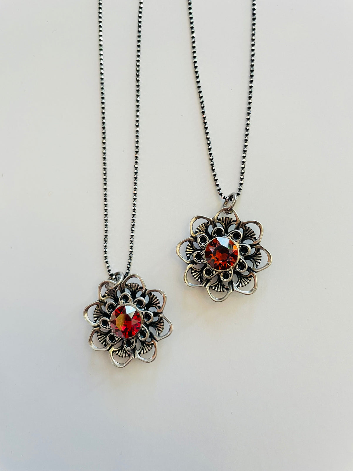 Filigree Flower Necklace featuring Padparadscha Luster or Scarlett Champagne set into Antique Silver Metal