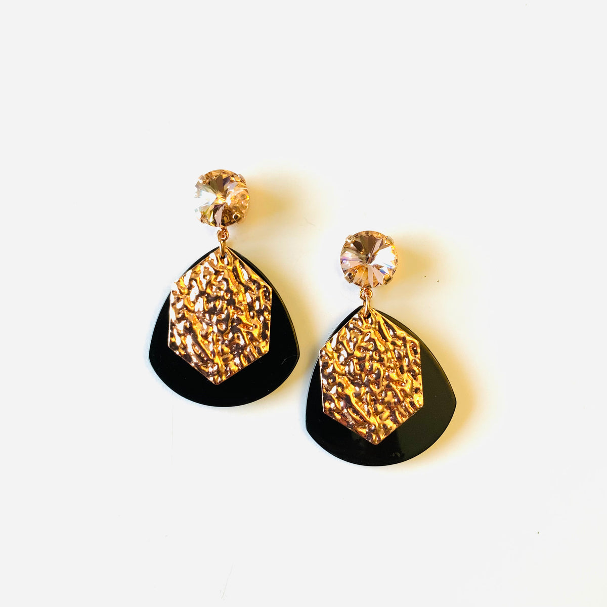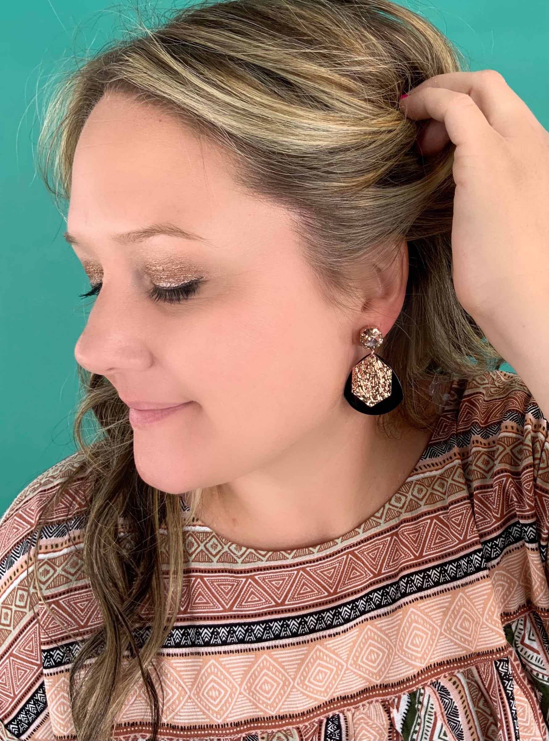 Find Your Tribe Earrings set into Rose Gold Metal with Vintage Rose Crystals and Black Teardrop Pendant with Crushed Rose Gold Metal Pendant