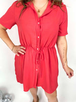 Get ready to turn heads in our Flirty Romper Dress! This short-sleeve, button-up romper is the perfect mix of playful and stylish. Made of non-wrinkle fabric, it has an elastic waist, waist strings for a tighter fit, functional buttons, and pockets on the shorts. Make a statement and stand out from the crowd in this unique and striking piece!