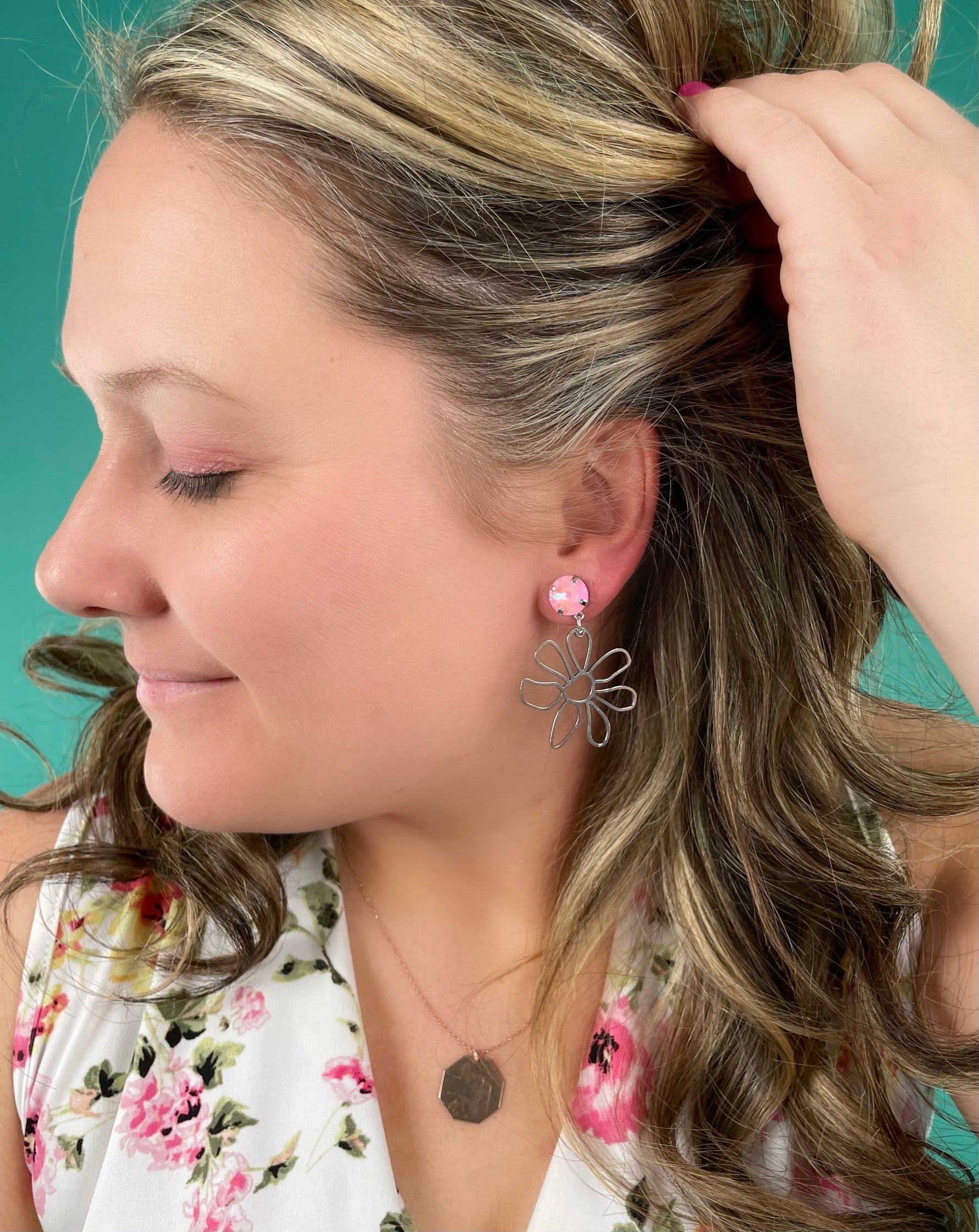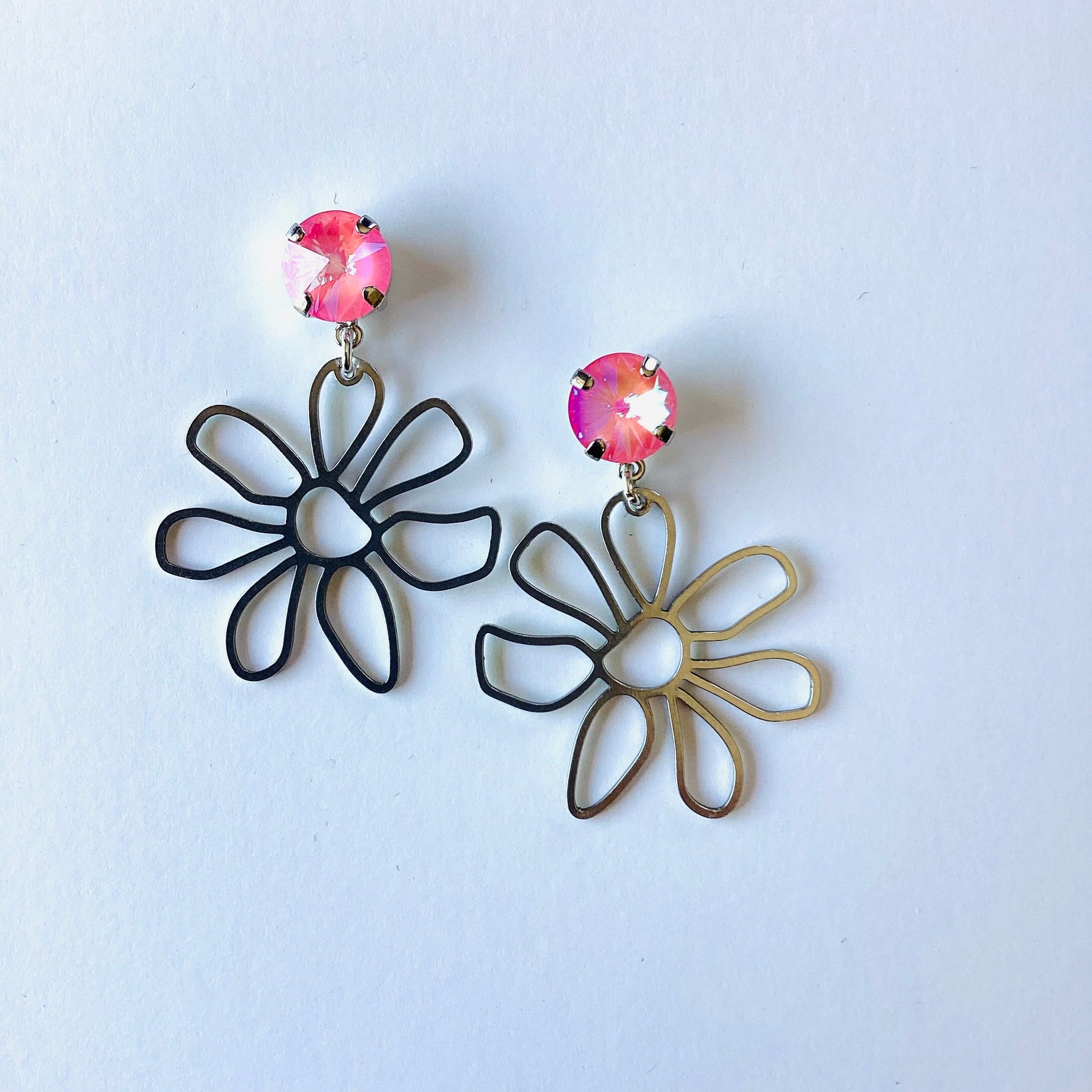 Flower Power Earrings set into Shiny Silver Metal with Ultra Peony Pink Crystals. Lightweight Metal Flower Pendant.
