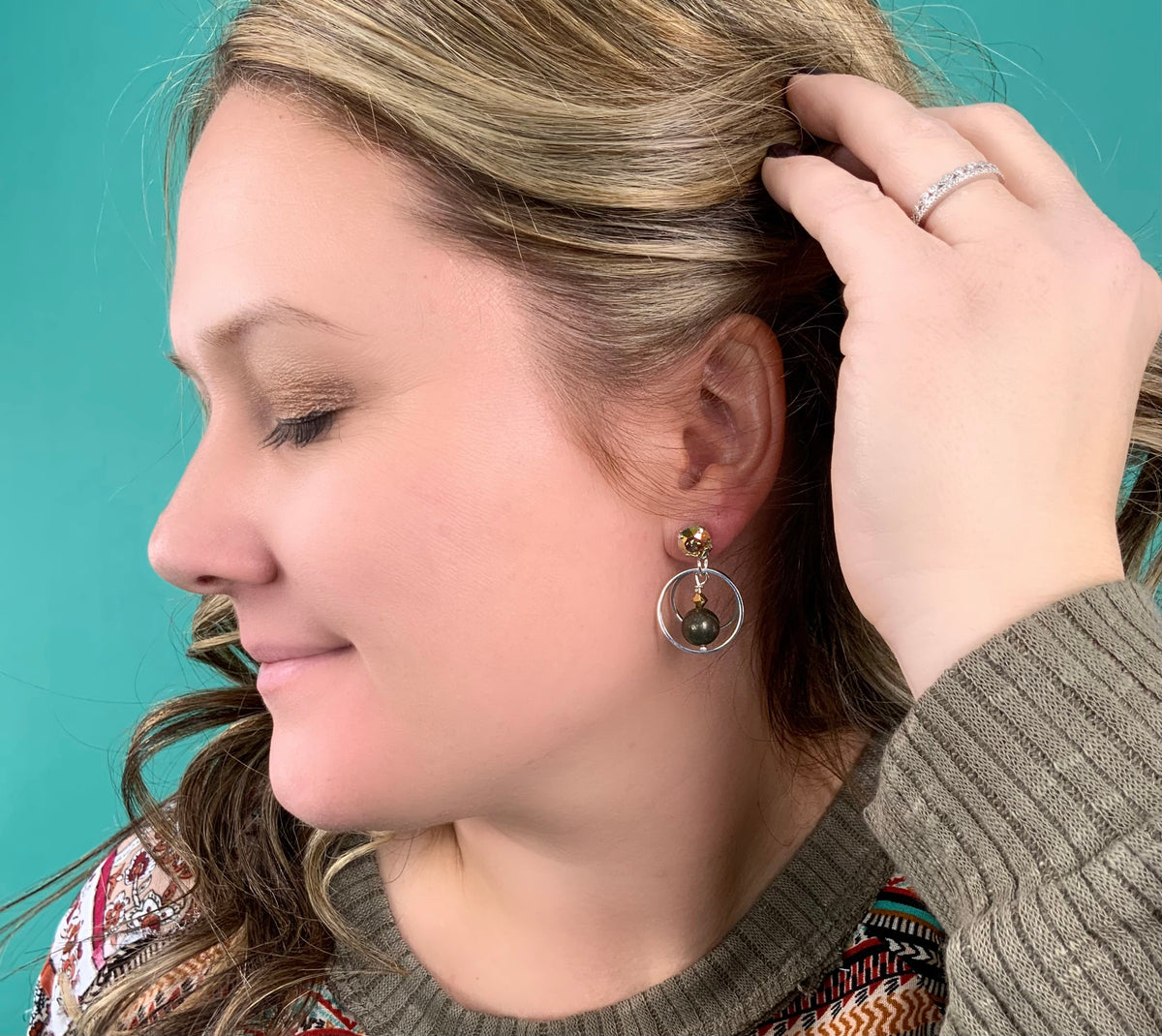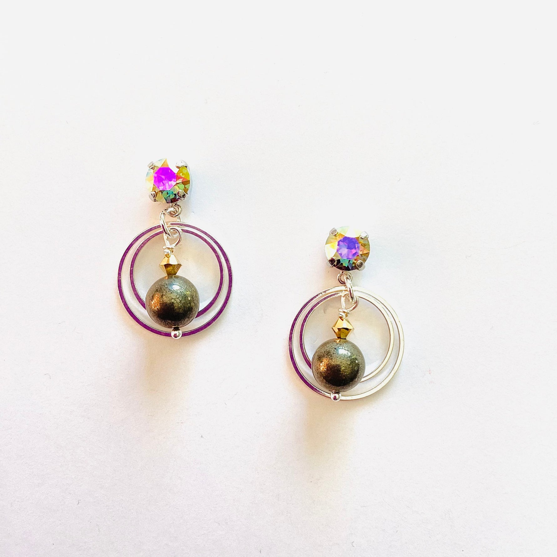 Forever Fun Earrings set into Shiny Silver Metal with Greenish/Gold Gemstone, Gold Crystals, and Custom Coated Crystal Post