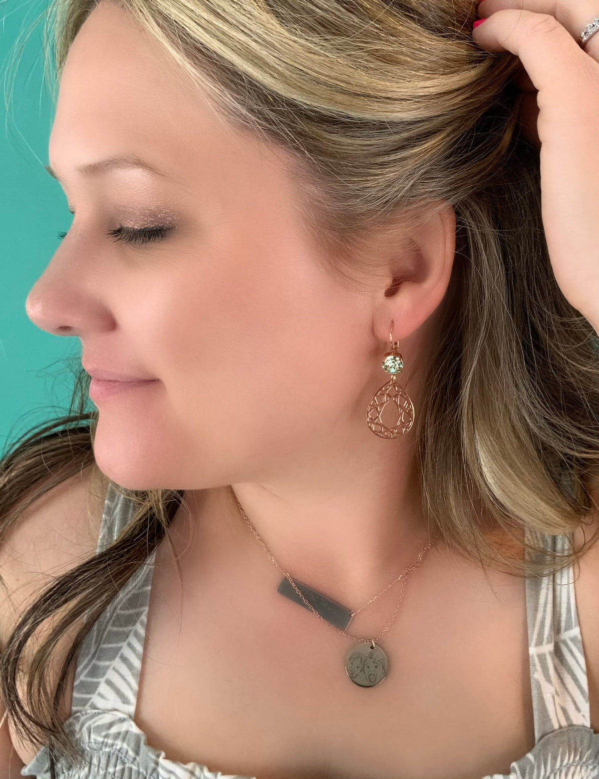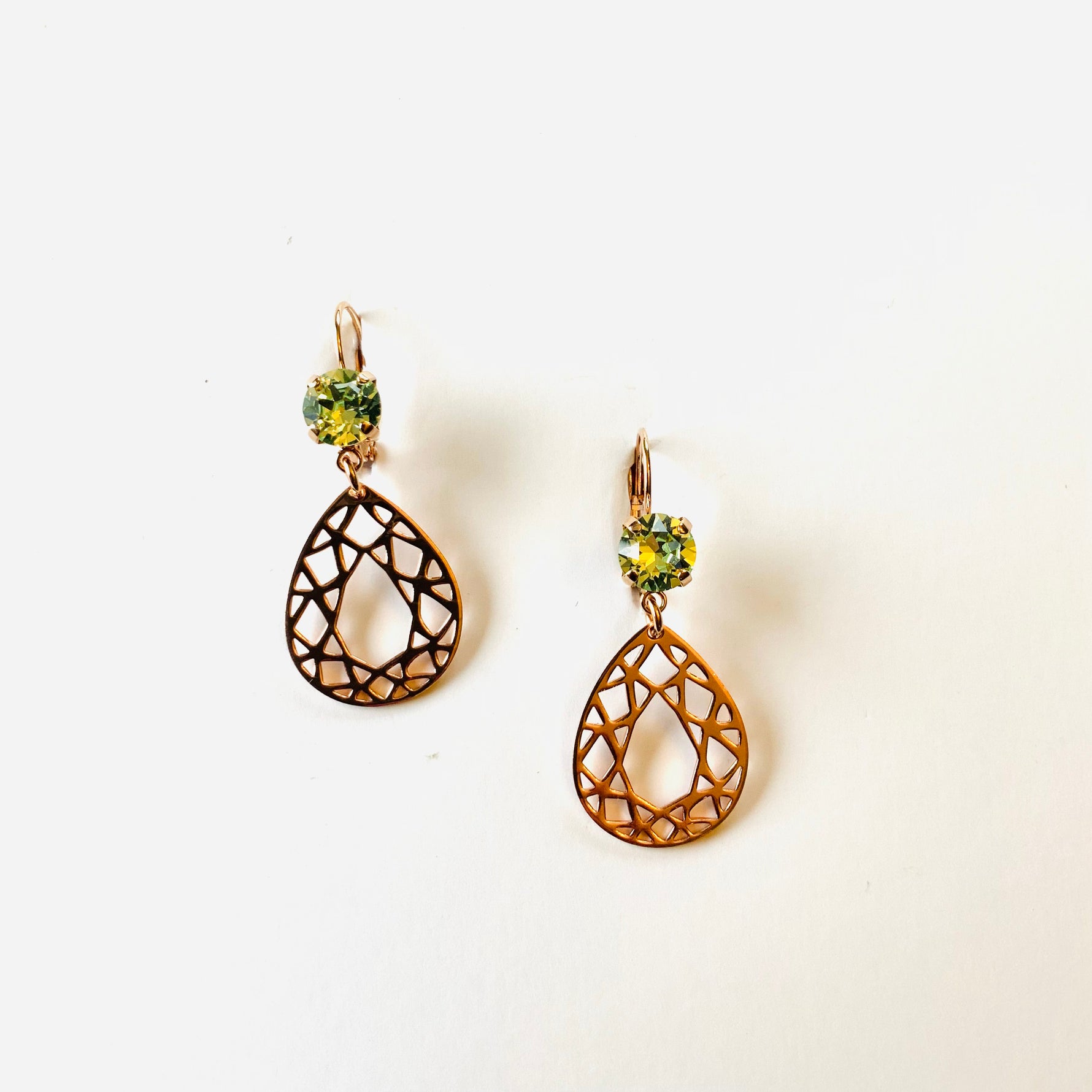 Geometric Pear Charm Earrings in Chrysolite set into Rose Gold Metal.